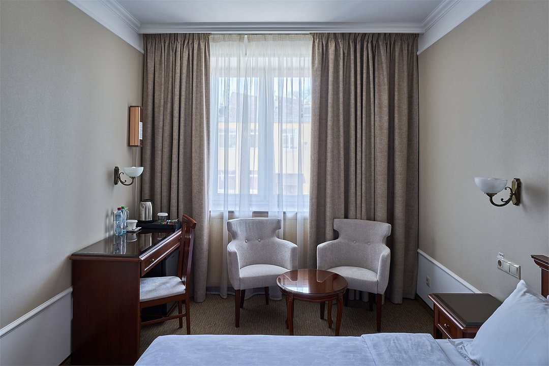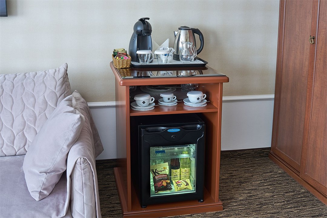 Номер повышенной комфортности с кофейной зоной. В номере возможно как одноместное, так и двухместное размещение.Услуги и удобства