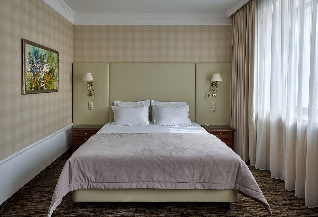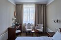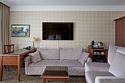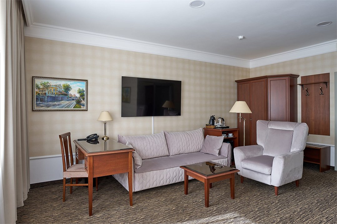Большой номер, состоящий из трех зон — гостевой, спальни, зоны кабинета. Общая площадь 30 кв. м. Номер оснащен всем необходимым для работы и отдыха. Номер оборудован холодильником, чайным столиком, письменным столом. В номере есть телефон, кондиционер и телевизорУслуги и удобства
