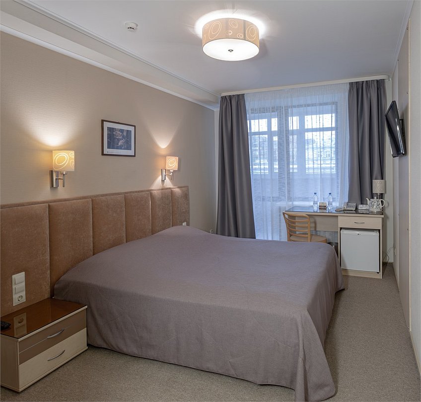 Общей площадью 20-22 м². Большой и светлый номер улучшенной категории оборудован электронными замками, кондиционером, прихожей с эргономичными крючками и чемоданницей; удобной комнатой с закрытым шкафом для одежды, одной кроватью 160*200 с ортопедическим матрасом и прикроватными тумбочками; рабочей зоной с письменным столом; зоной отдыха с креслом; холодильником, телефоном, кабельным телевидением, бесплатным Wi-Fi; санузлом с ванной, полотенцами, средствами гигиены.Услуги и удобства