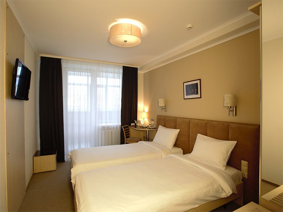 Номер общей площадью 20–22 м² с балконом, окна которого выходят во внутренний тихий двор. Оснащён современными электронными замками. В прихожей — эргономичные крючки и чемоданница для удобства гостей. В спальне — закрытый шкаф для одежды, две трансформируемые кровати с ортопедическими матрасами и прикроватные тумбочки. Рабочая зона оборудована письменным столом. Также в номере предусмотрены: холодильник, телефон, кабельное телевидение и бесплатный Wi-Fi. Санузел укомплектован ванной или душевой кабиной, полотенцами и средствами личной гигиены.Услуги и удобства
