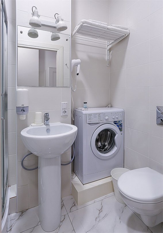 Номер общей площадью 20 кв.м. включает: - кухонную зону с микроволновой печью, холодильником, электрочайником и набором посуды; - зону для сна с двумя кроватями 90*200, трансформируемыми в одну двуспальную, с ортопедическим матрасом; - зону для отдыха с кондиционером, кабельным телевидением, телефоном для круглосуточной связи с сотрудниками ресепшн, светонепроницаемыми жалюзи, бесплатным Wi-fi; - санузел с душевой кабиной, стиральной машиной, сушилкой, гладильной доской, утюгом, комплектом полотенец, халатом, одноразовыми тапочками и средствами гигиены. Для удобства гостей предоставляется приветственный хозяйственный набор (средство для мытья посуды, губка, салфетки, капсулы для стирки).Услуги и удобства
