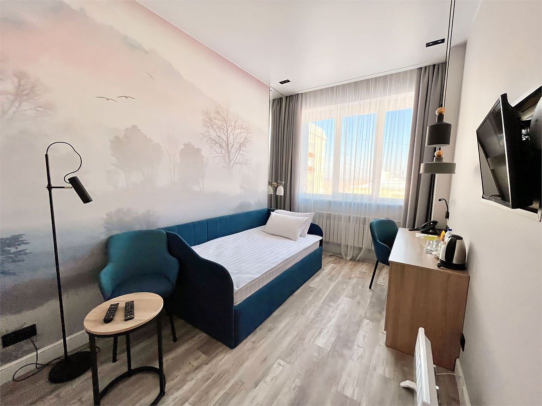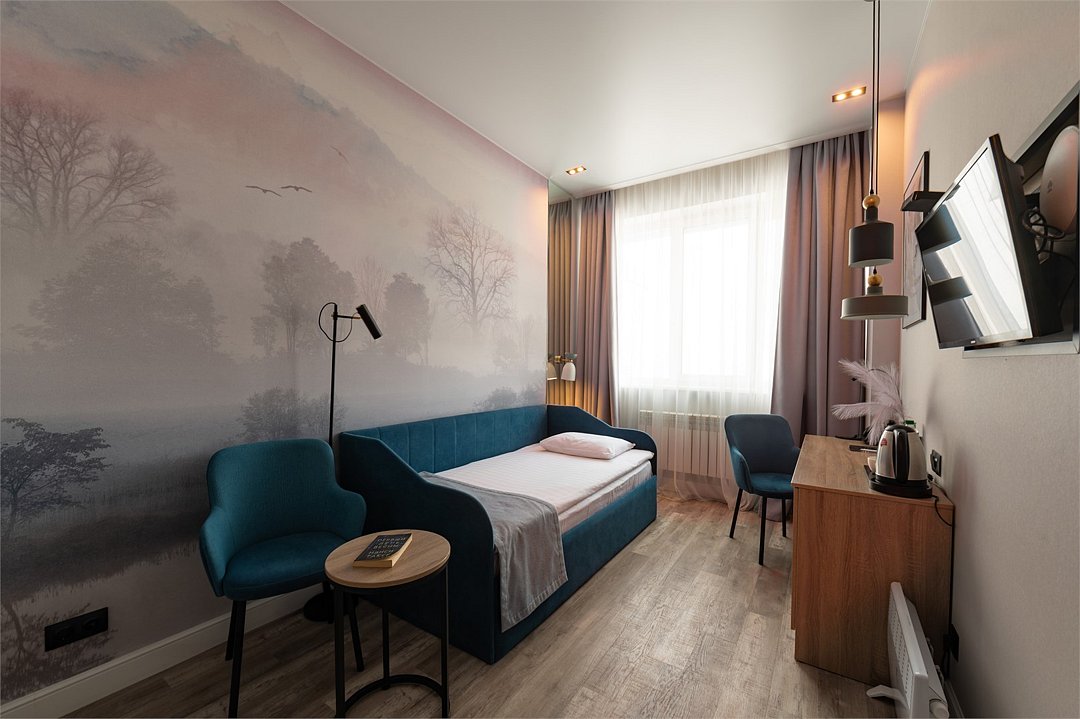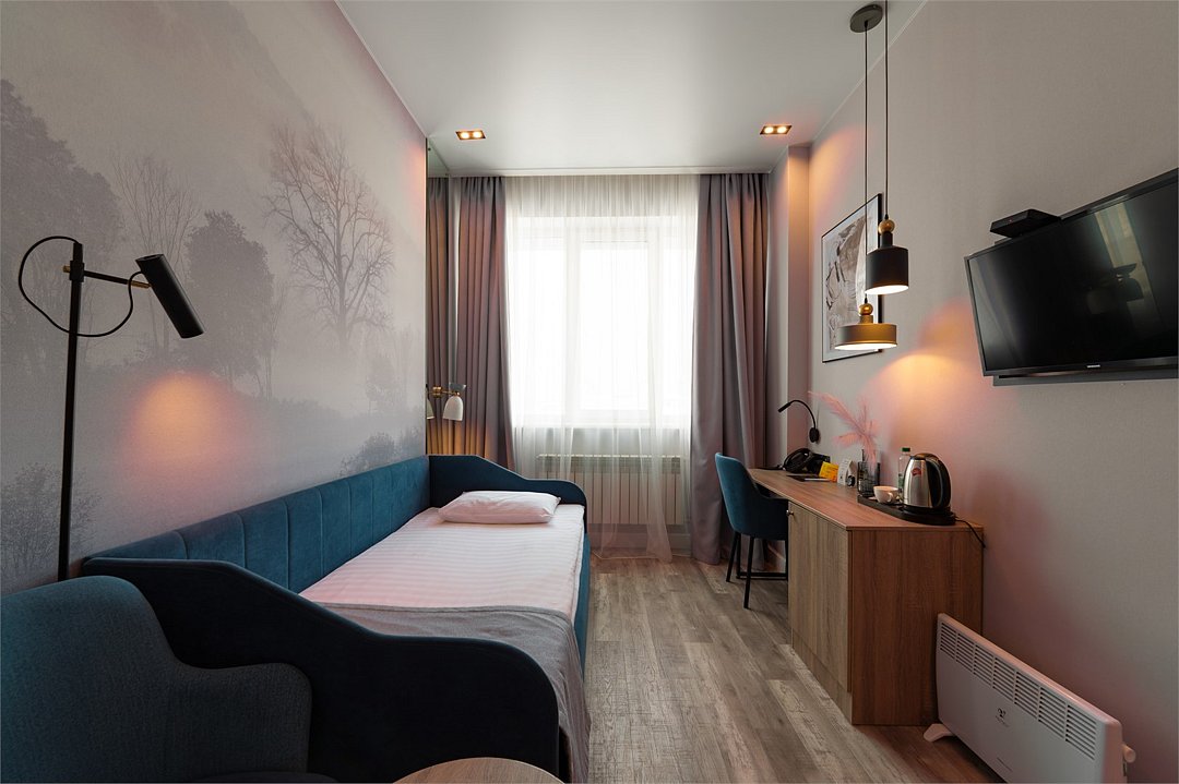 Площадь номера 20 кв. м. В номере: односпальная кровать 100х200см, осветительные приборы, телефон, телевизор с диагональю 32 дюйма, рабочая зона (стол и стул), платяной шкаф-купе, мини-холодильник, сейф, кондиционер. Санузел с душевой кабиной, раковина, фен.Услуги и удобства
