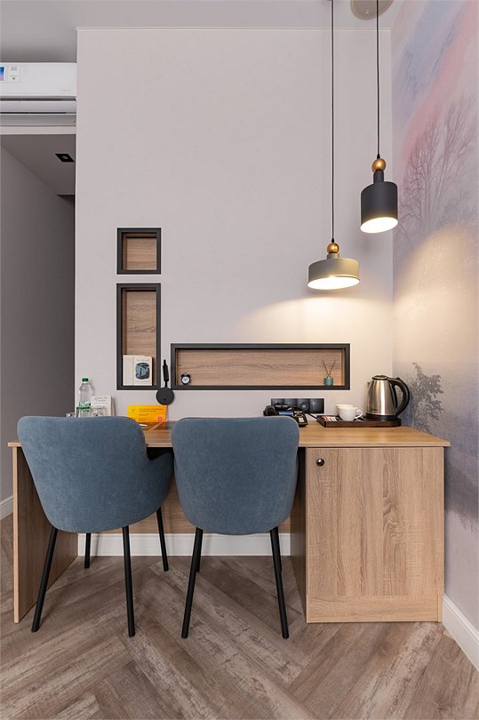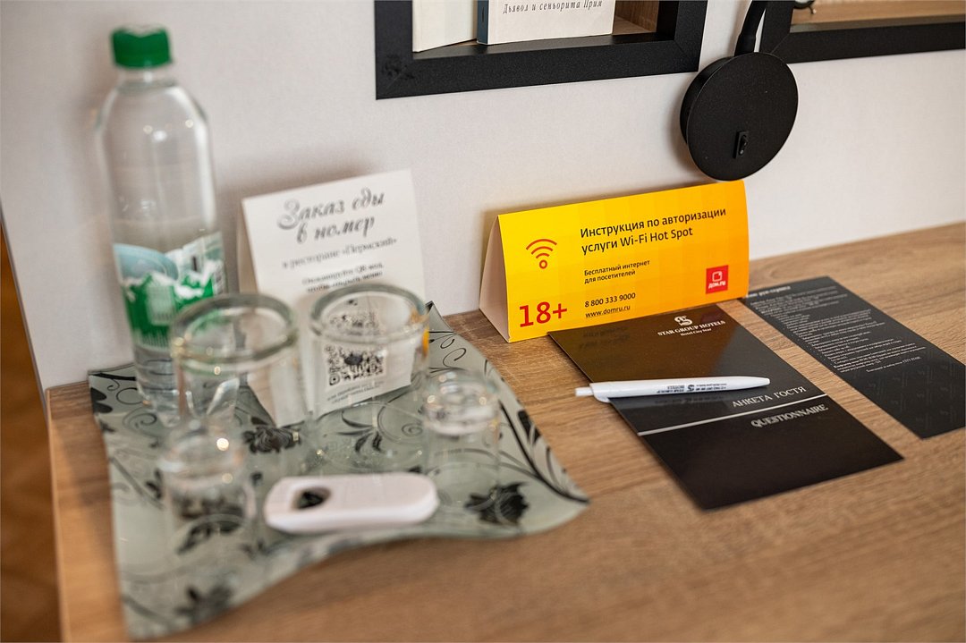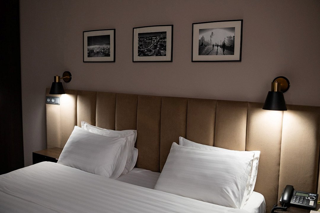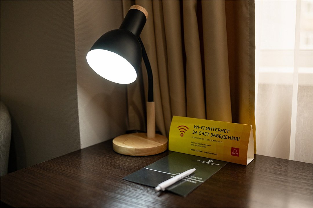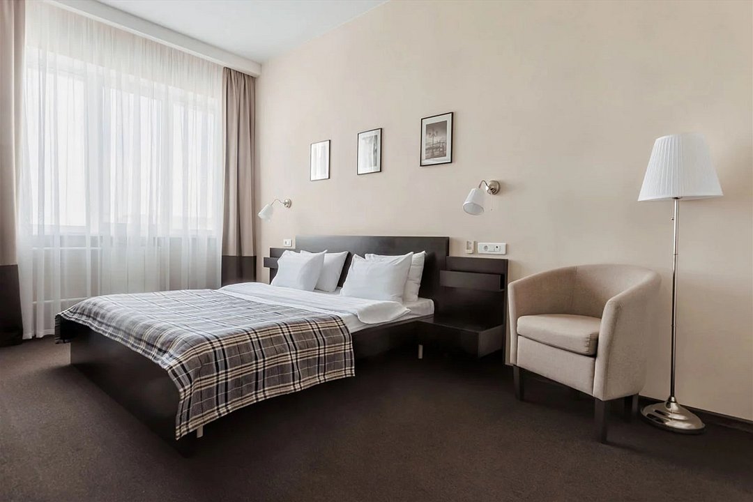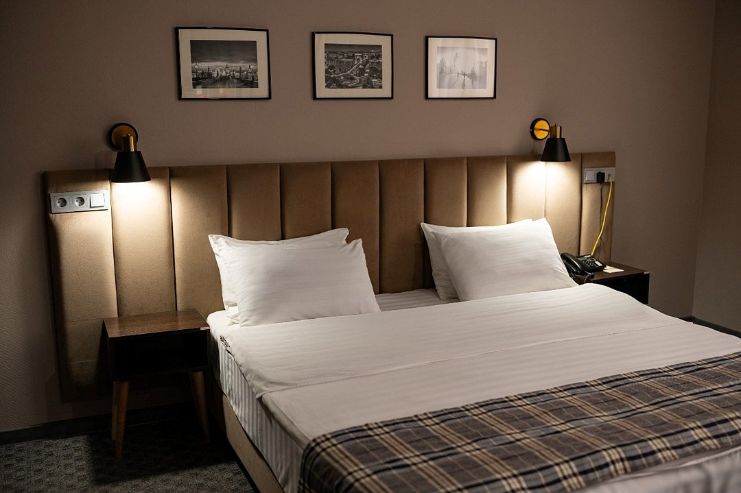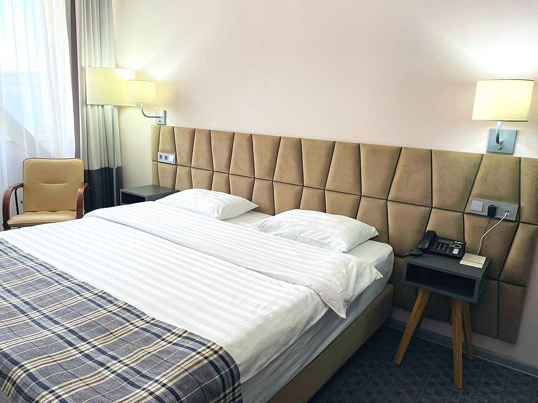 Площадь номера 22 кв. м. В номере: двуспальная кровать 180х200см, прикроватные тумбы, осветительные приборы, телефон, телевизор с диагональю 26 дюймов, рабочая зона (стол и стул), платяной шкаф-купе, мини-холодильник, сейф, кондиционер. В коридоре шкаф для верхней одежды. Санузел более 4 кв.м., с душевой кабиной (с ванной), раковина, косметическое зеркало, фен.Услуги и удобства