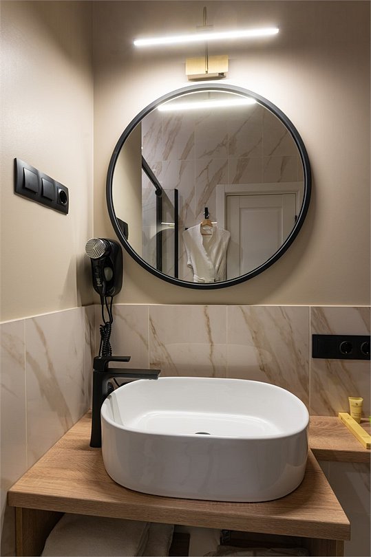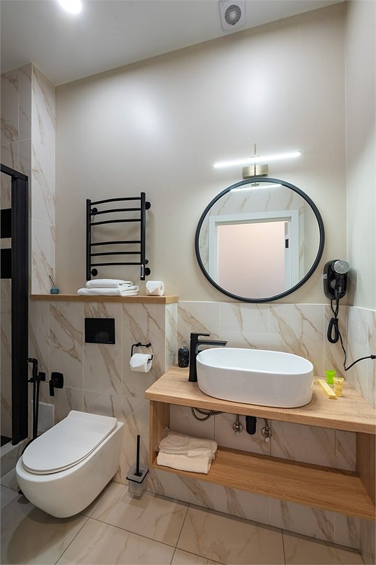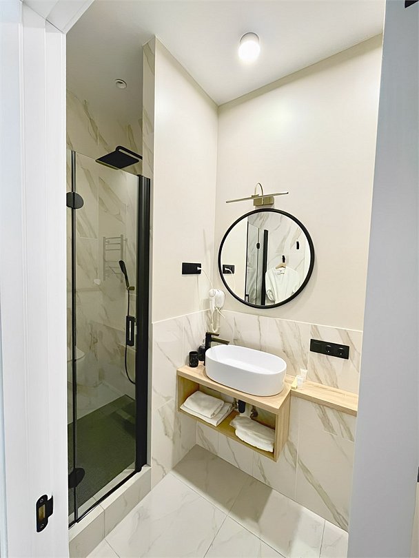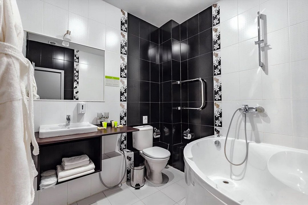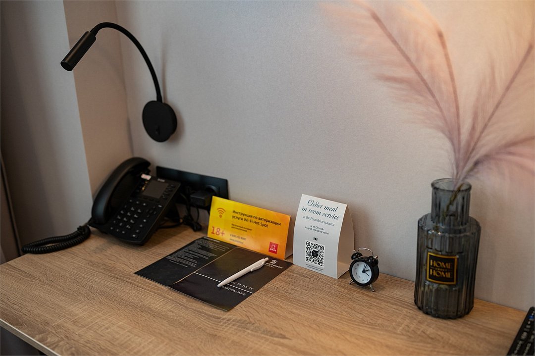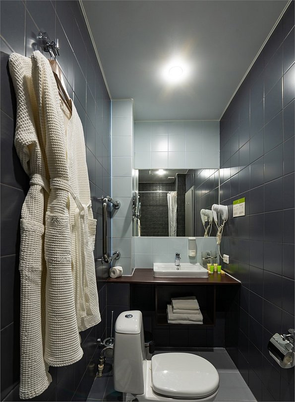 Площадь номера 22 кв. м. В номере: двуспальная кровать 160х190см, прикроватные тумбы, осветительные приборы, телефон, телевизор с диагональю 32 дюймов, рабочая зона (стол и стул), платяной шкаф-купе, мини-холодильник, сейф, кондиционер. Санузел более 4 кв.м., с душевой кабиной, раковина, косметическое зеркало, фен.Услуги и удобства