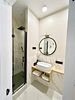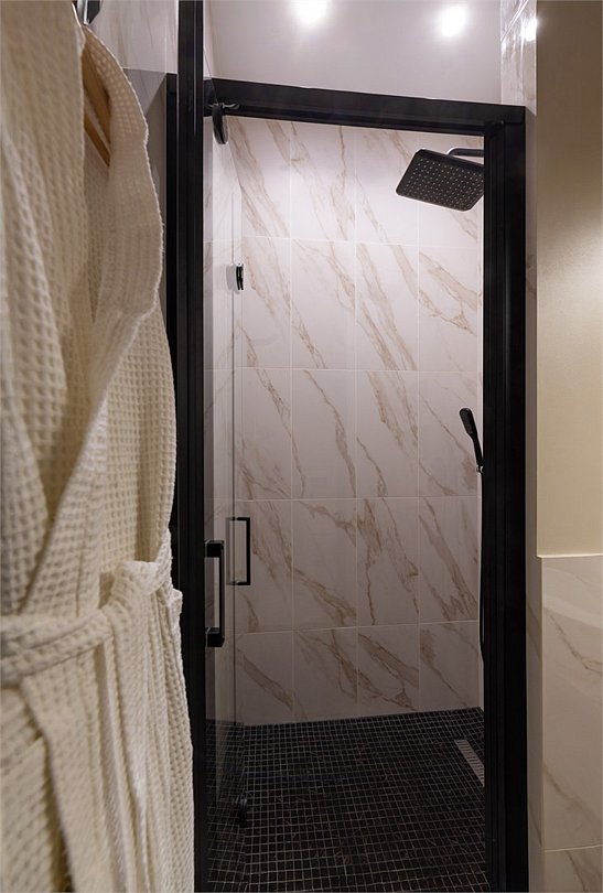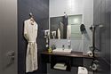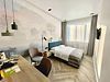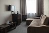 Просторный номер общей площадью 45.5 м2 (условное разделение на две комнаты примерно по 22-23 кв.м.каждая). В спальне двуспальная кровать 180х200см и односпальная кровать 90х200см, прикроватные тумбы, светодиодная подсветка в нише, телефон, платяной шкаф, сейф. В гостиной комнате набор мягкой мебели: диван, журнальный стол, рабочая зона (стол и кресло), телевизор с диагональю 32 дюйма, кондиционер, освещение нишевое, потолочное, светодиодная лента. В коридоре тахта, шкаф для верхней одежды, подставка под багаж, зеркало. Просторный санузел (6 кв.м.) с ванной и раковиной, косметическое зеркало, фен.Услуги и удобства