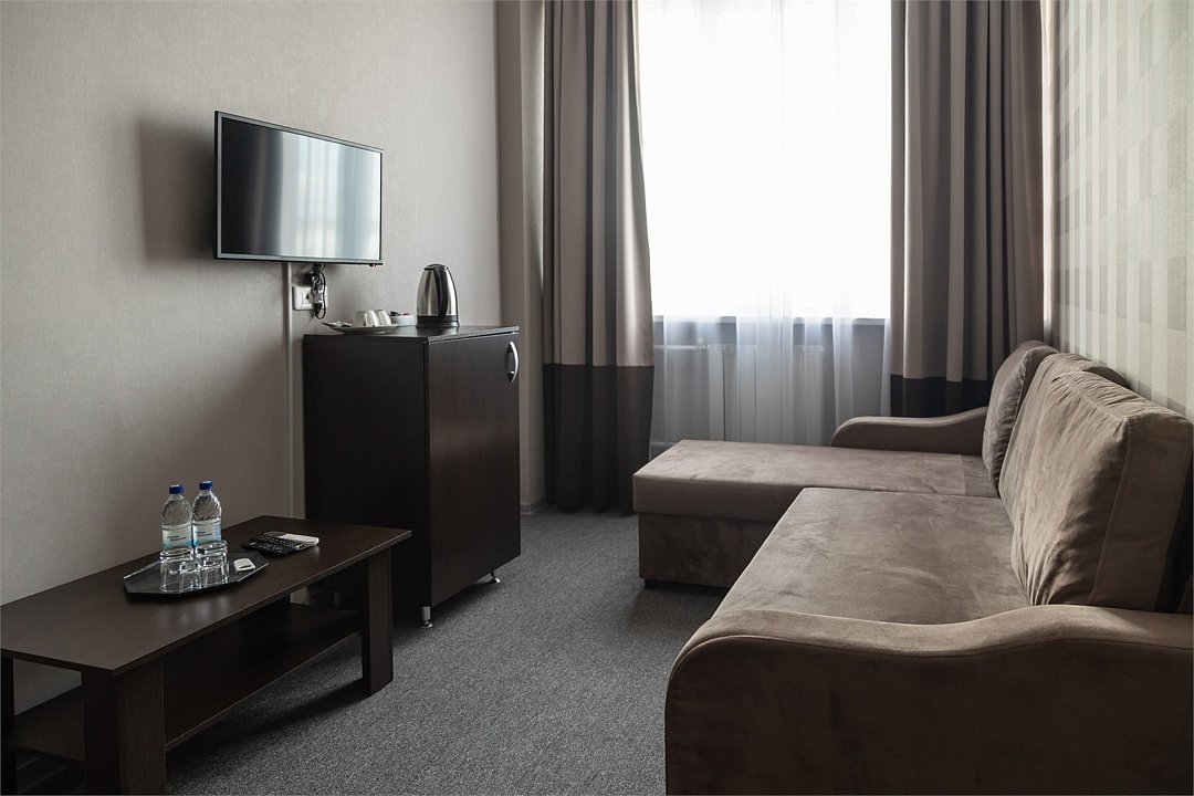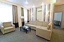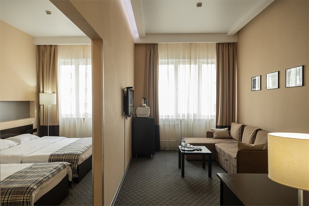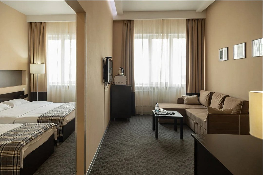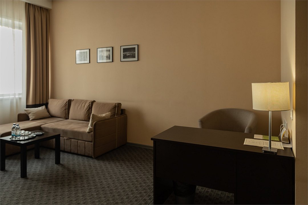 Площадь номера 35-45 м2. В номере: двуспальная кровать 160х200см, прикроватные тумбы, осветительные приборы, набор мягкой мебели: диван, журнальный стол, платяной шкаф, мини-холодильник, сейф, телефон, телевизор с диагональю 26 дюймов, кондиционер, рабочая зона (стол и кресло). Санузел с ванной и раковиной, косметическое зеркало, фен. В коридоре шкаф для верхней одежды, подставка под багаж, зеркало.Услуги и удобства