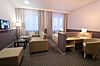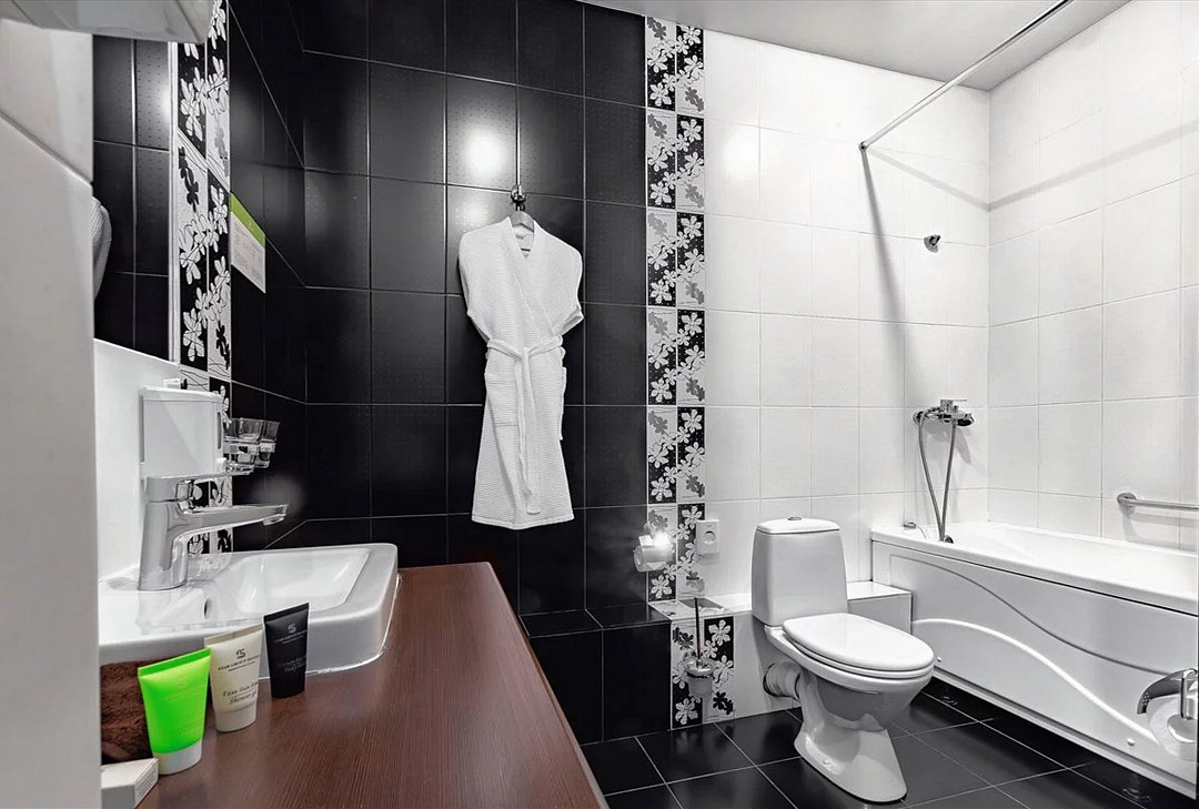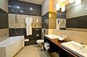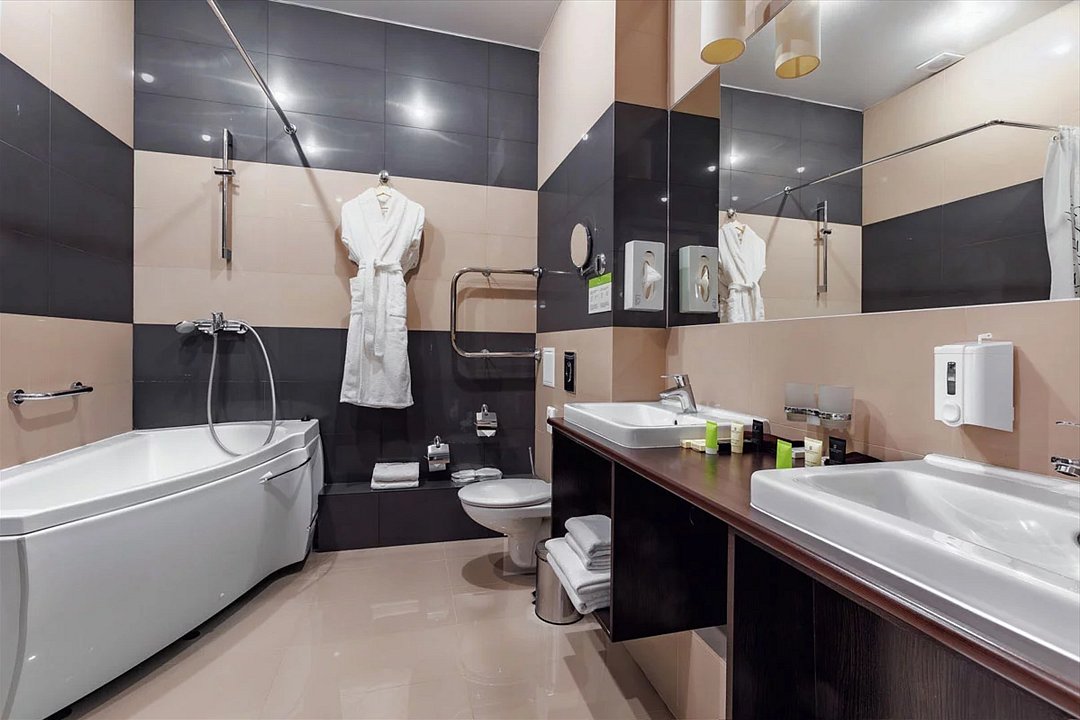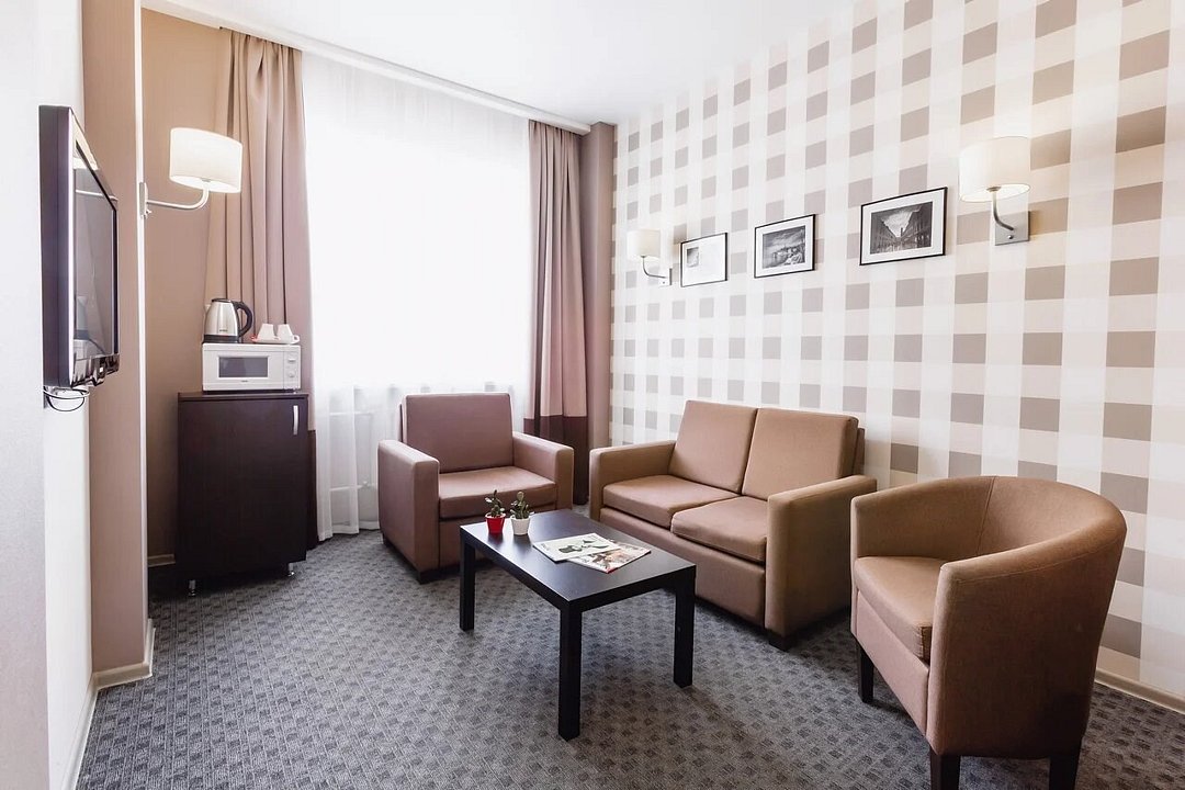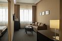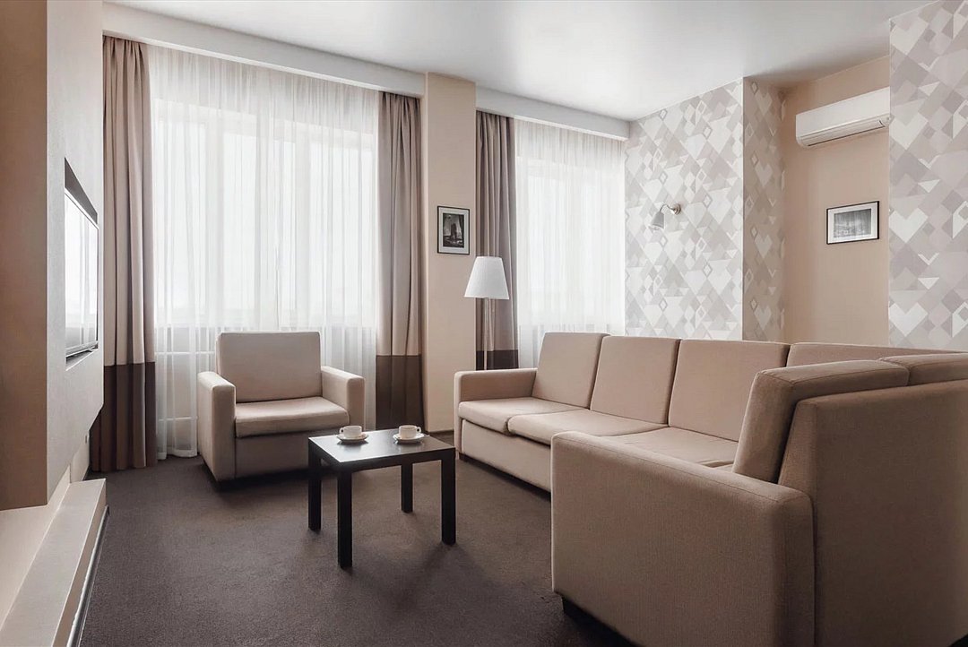 Площадь номера 35-45 м2. В номере: двуспальная кровать 160х200см, прикроватные тумбы, осветительные приборы, набор мягкой мебели: диван, журнальный стол, платяной шкаф, мини-холодильник, сейф, телефон, телевизор с диагональю 26 дюймов, кондиционер, рабочая зона (стол и кресло). Санузел с ванной и раковиной, косметическое зеркало, фен. В коридоре шкаф для верхней одежды, подставка под багаж, зеркало.Услуги и удобства