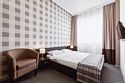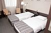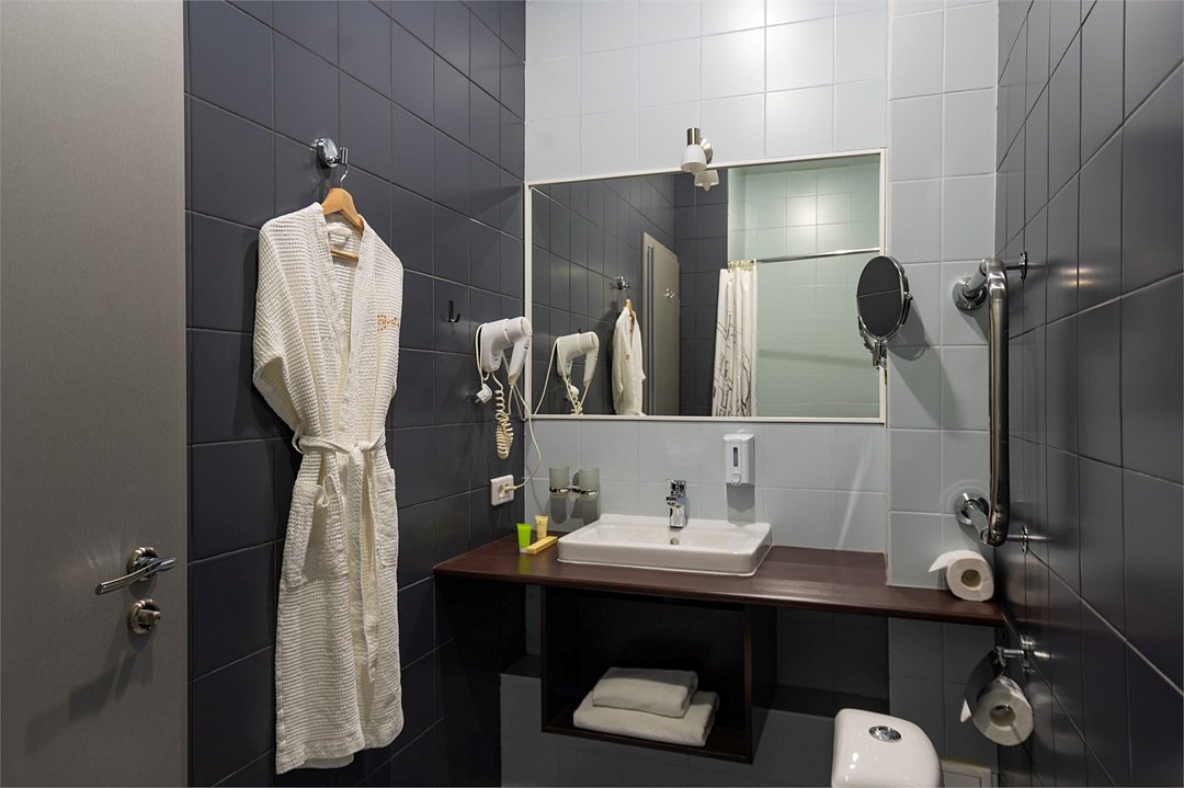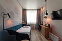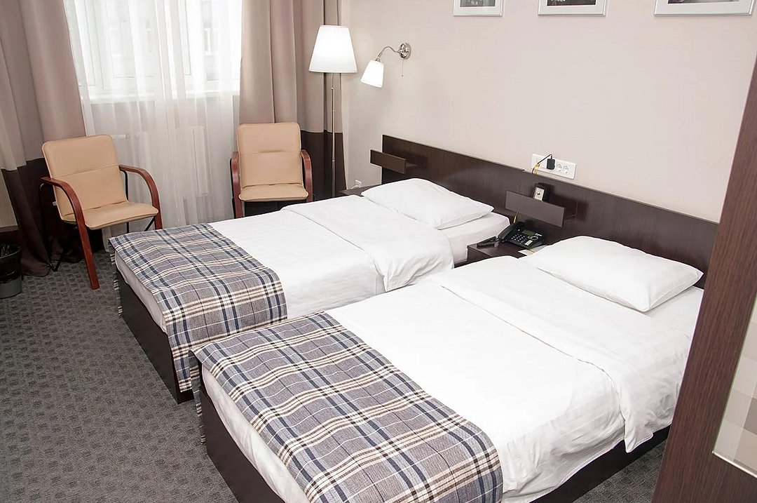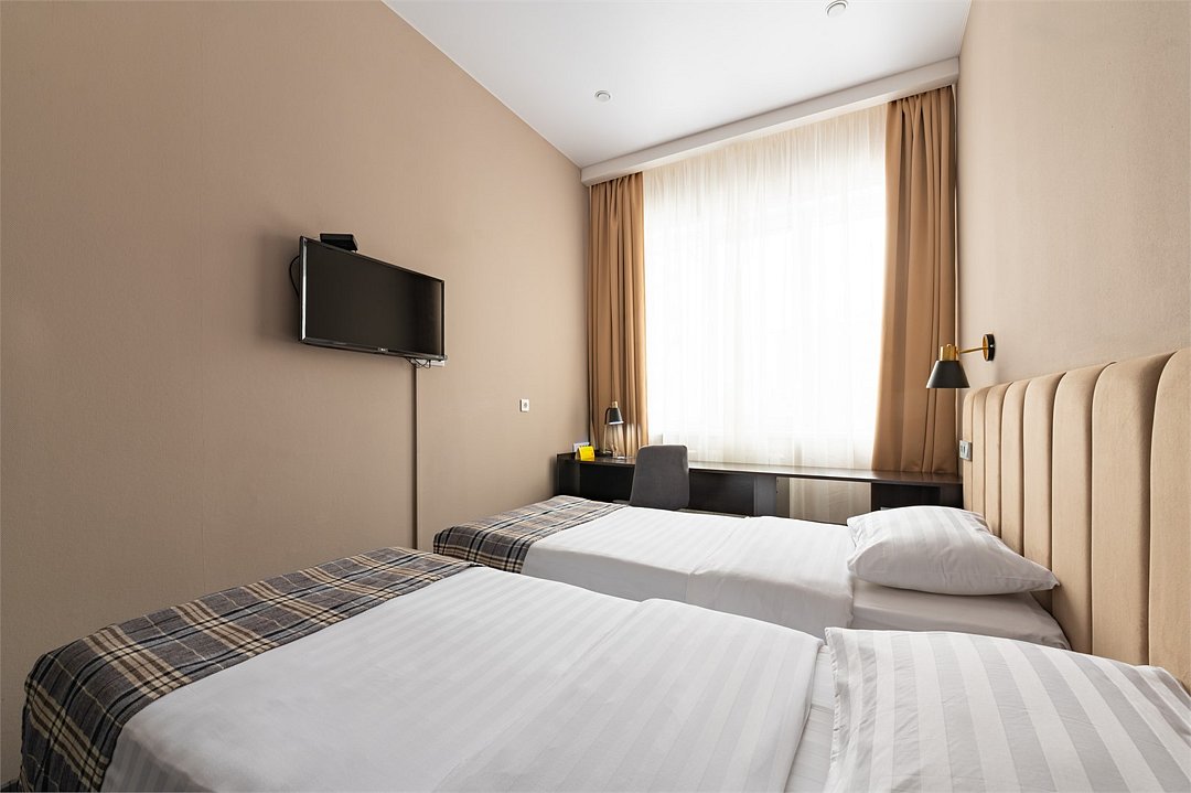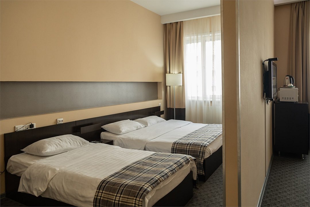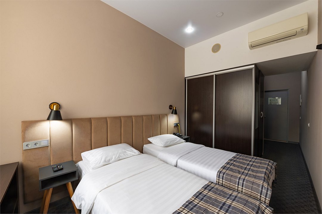 Площадь номера 22 кв. м. В номере: 2 односпальные кровати 90х200см, прикроватные тумбы, осветительные приборы, телефон, телевизор с диагональю 26 дюймов, рабочая зона (стол и стул), платяной шкаф-купе, мини-холодильник, сейф, кондиционер. В коридоре шкаф для верхней одежды. Санузел более 4 кв.м., с душевой кабиной, раковина, косметическое зеркало, фен.Услуги и удобства