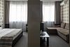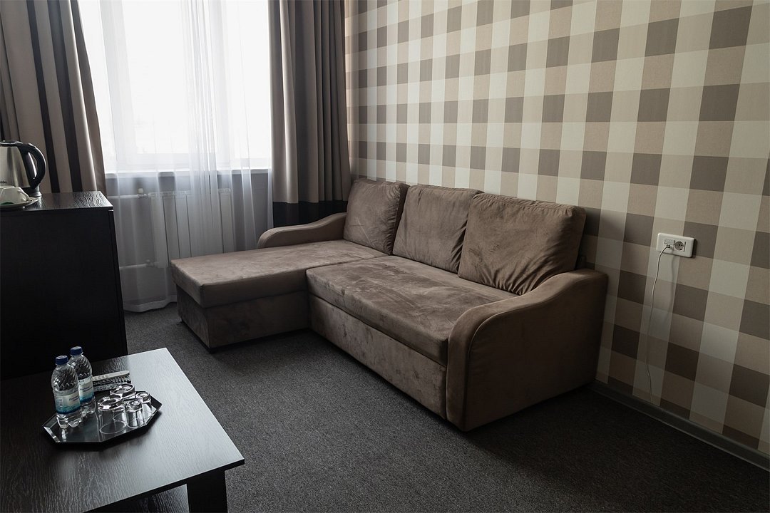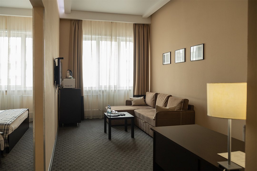 Просторный номер общей площадью 45 кв. м. (условное разделение на две комнаты примерно по 22-23 кв.м. каждая). В спальне двуспальная кровать 180х200см, прикроватные тумбы, осветительные приборы, платяной шкаф. В гостиной комнате: набор мягкой мебели: диван, кресло, журнальный стол, рабочая зона (стол и кресло), мини-холодильник, сейф, телевизор с диагональю 32 дюйма, телефон, кондиционер, Санузел 6,8 кв. м., с ванной и раковиной, косметическое зеркало, фен. В коридоре шкаф для верхней одежды, тахта, подставка под багаж, зеркало.Услуги и удобства