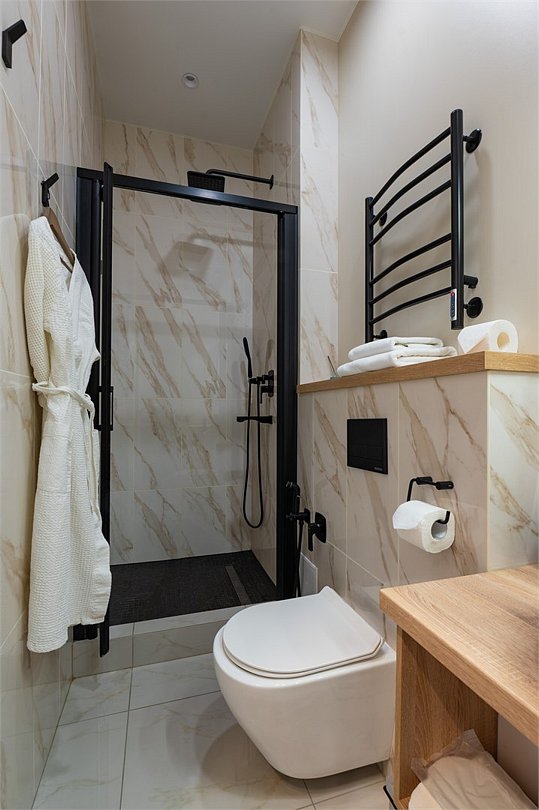 Просторный номер общей площадью 67 м2. В номере 2 комнаты 45 кв.м. и 22 кв.м.: в спальне двуспальная кровать 180х200см, прикроватные тумбы, осветительные приборы,шкафы-купе, облегченное кресло, в гостиной зоне набор мягкой мебели: диван, кресло, журнальный стол, рабочая зона (стол и облегченное кресло), телевизор с диагональю 40 дюймов, кондиционер, в зоне кухни небольшое рабочее место, столовый набор: стол и 4 стула. Просторный санузел с ванной и 2-мя раковинами, дополнительная подсветка зеркала, косметическое зеркало, фен. Коридор: платяной шкаф, подставка под багаж, зеркало.Услуги и удобства