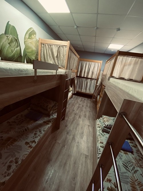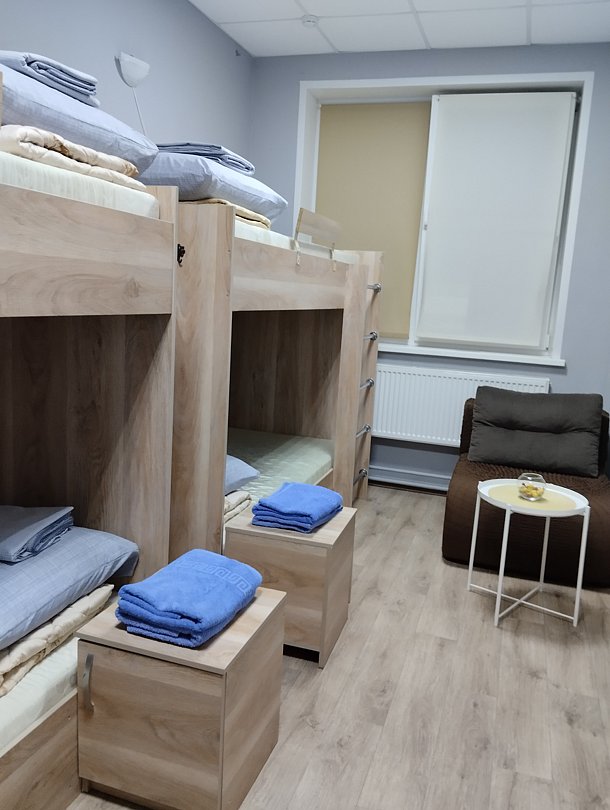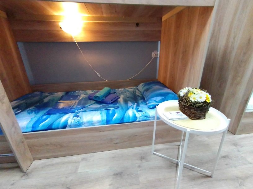 Четырехместный семейный номер. В номере две двухъярусные кровати. Каждое место оборудовано-матрас,одеяло, подушка, постельное белье. Индивидуальные шкафчики, освещение и розетки, зеркало.В номере