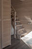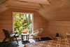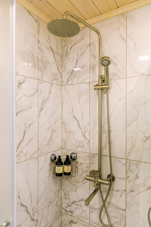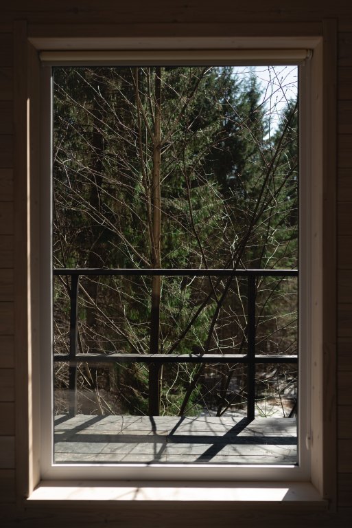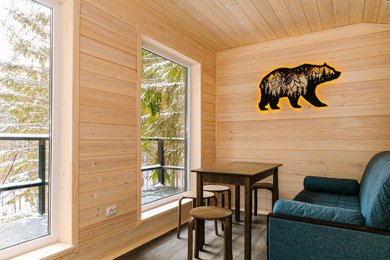 В предбаннике — удобный диван с чистым непромокаемым наматрасником из хлопка, столик, электрический чайник, чайный набор, вода и чай. Есть туалет и раковина. Из панорамного окна открывается вид на сосновый лес — окно непроницаемо снаружи, при необходимости можно воспользоваться жалюзи.