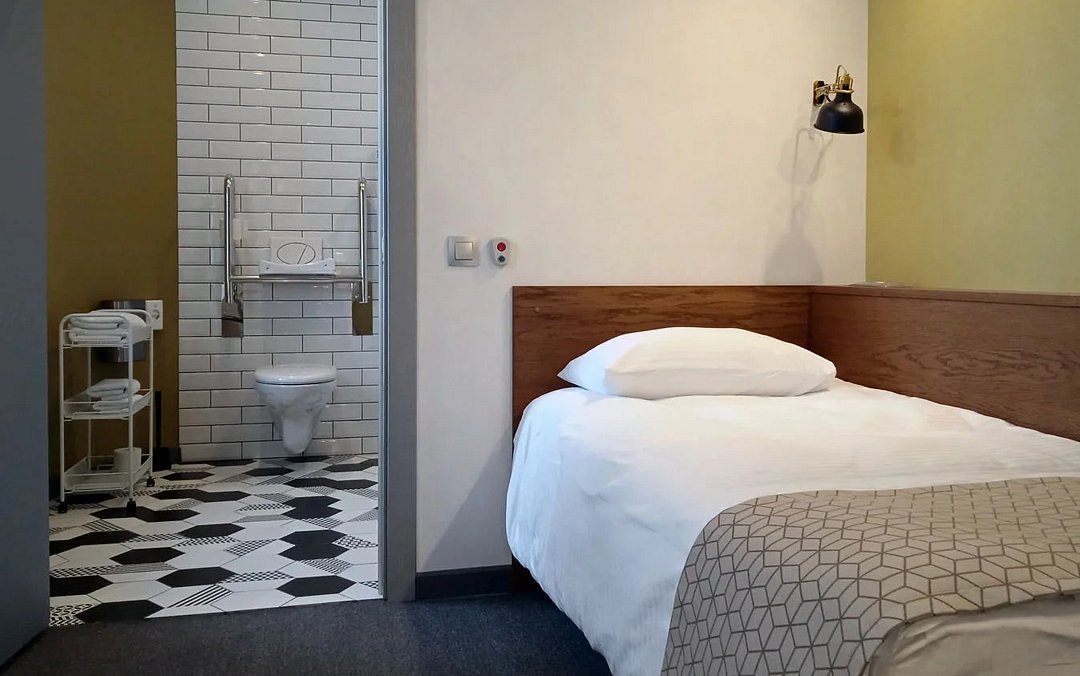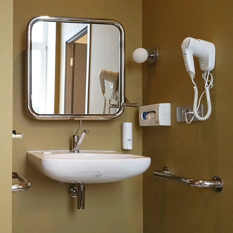 Номер адаптирован для комфортного размещения гостей с ограниченными физическими возможностями. Достаточно просторная комната – 1 односпальная кровать, телевизор, телефон, холодильник, сейф, душевая кабина, фен, стол для работы.Услуги и удобства