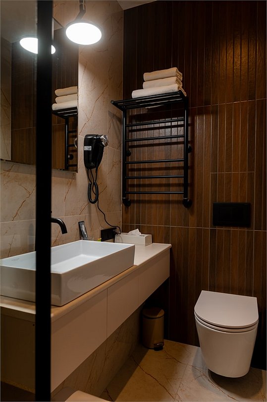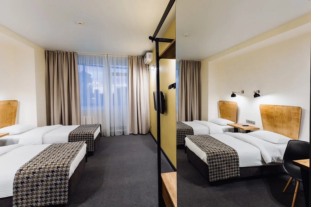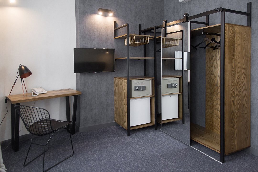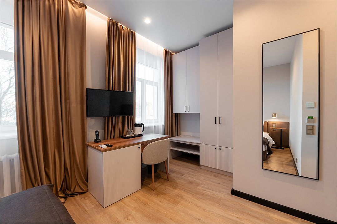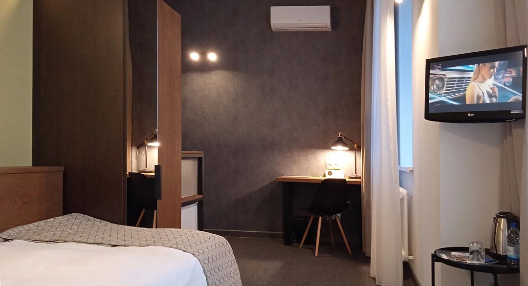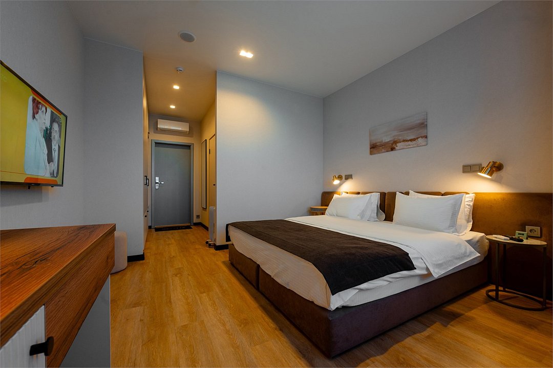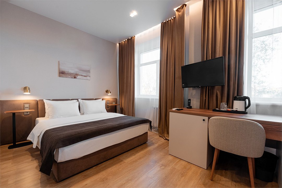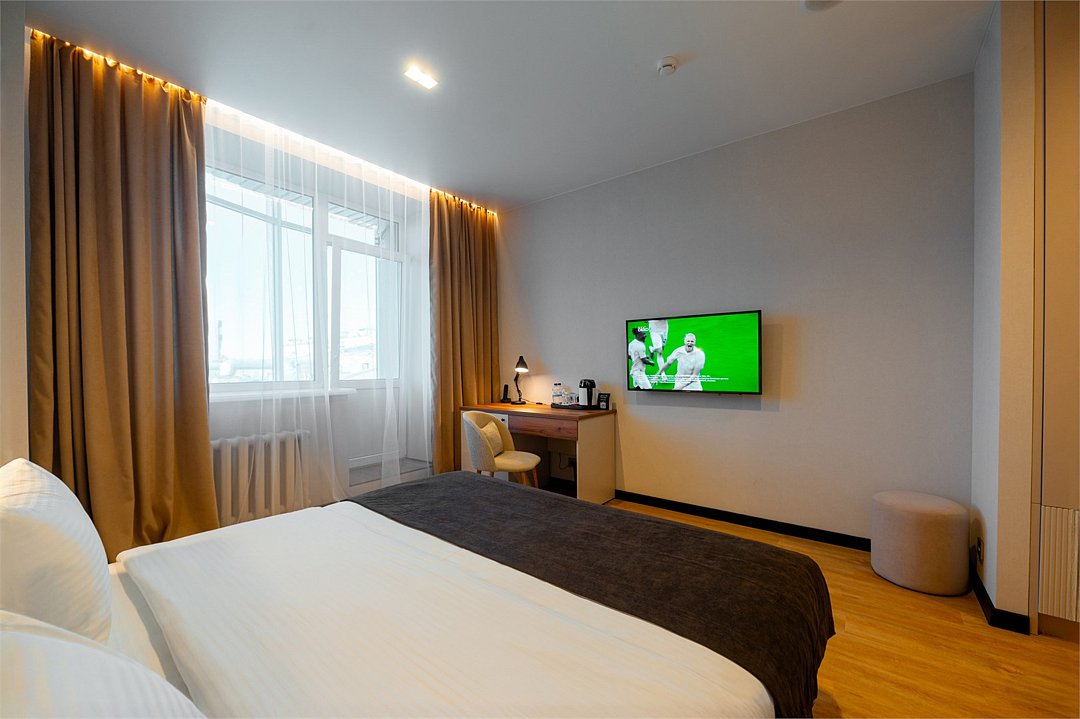 телевизор, Wi-Fi, холодильник, кондиционер, светильник, настольные лампы, будильник, обогреватель, душевая кабина, халаты, банные полотенца, тапочки, косметические средства, двуспальная кровать, две односпальные или большая двуспальная кровать, шкаф для одежды, вешалки, зеркало, чайный набор, чайник, унитаз, раковина, питьевая вода, душ, вид на город, стул, стол, туалет, цифровое тв, внутренний телефон, телевизор с плоским экраном, телевизор со Smart TV, номер для некурящих, рабочий стол, уборка номера, бутилированная вода, шапочка для душа, мыло, можно с питомцамиВ номере
