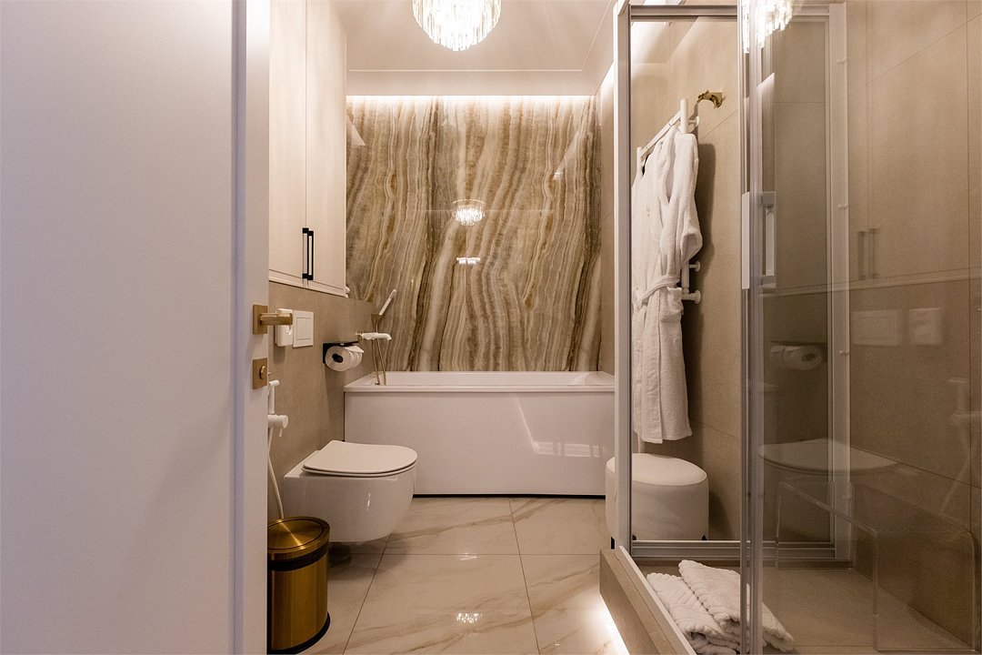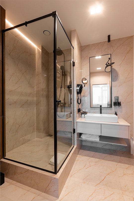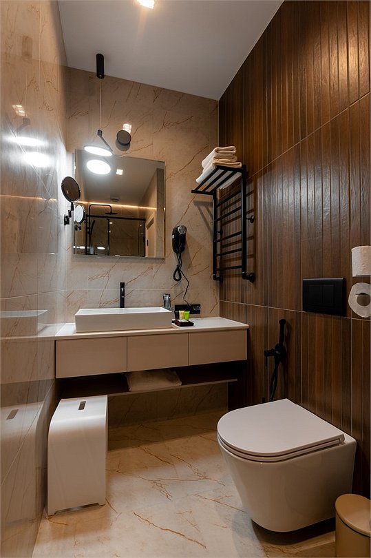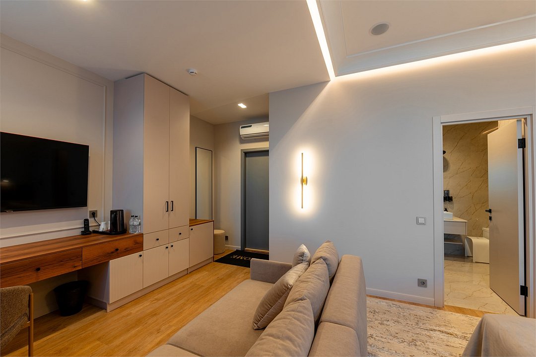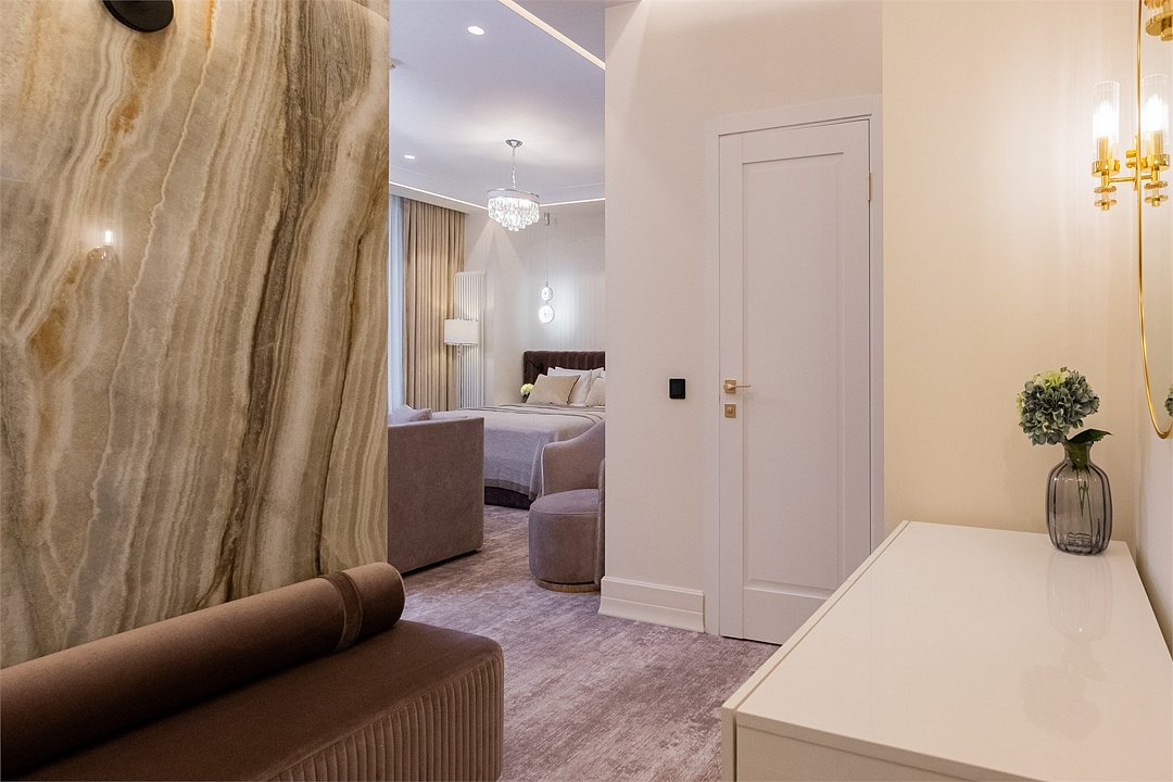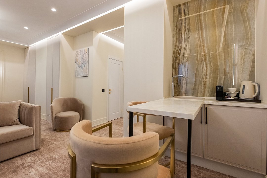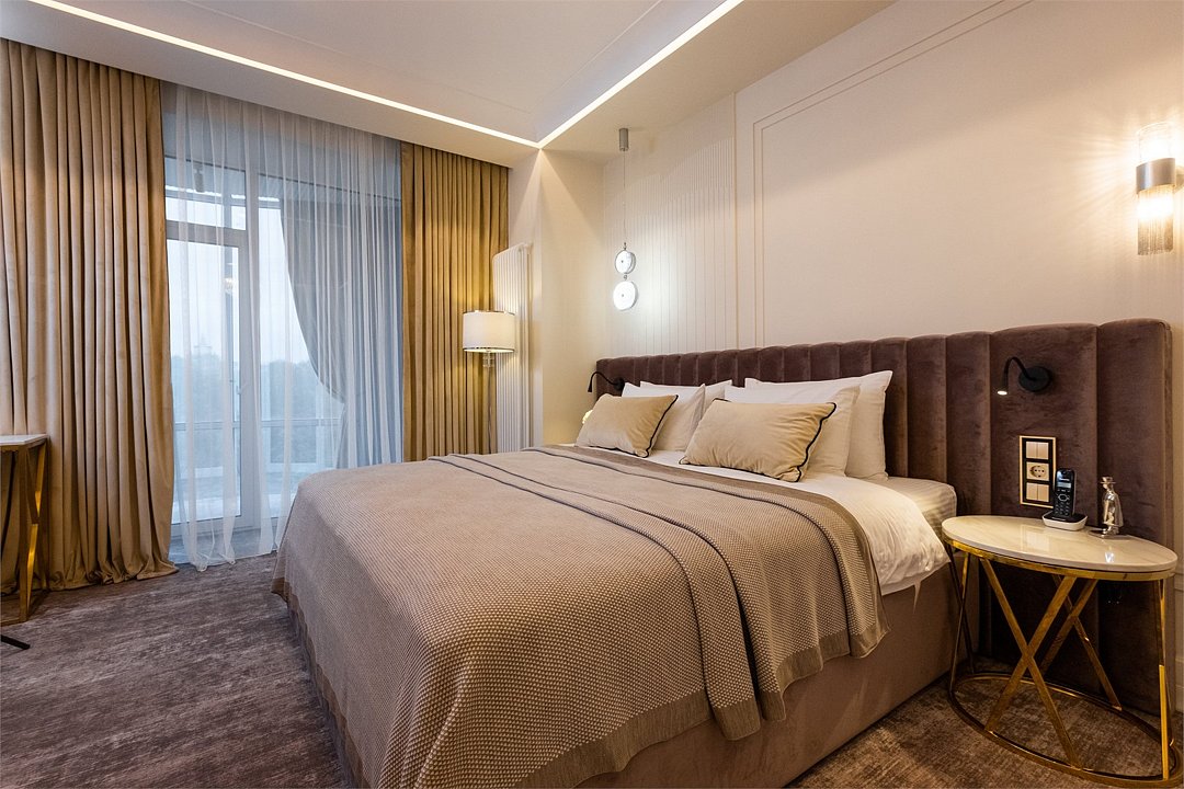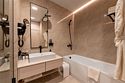 Дизайн номера был создан для истинных ценителей комфорта: удобная рабочая зона гармонично сочетается с кроватью размера King Size и мягким диваном. Элегантная ванная комната включает ванну и большую душевую кабину. Мягкие приглушенные тона интерьера, гармоничное освещение со множеством сценариев, лаконичность форм – все это создает неповторимую атмосферу тепла и уюта. The design of the room was created for true connoisseurs of comfort: a convenient work area harmoniously combines with a king-size bed and a soft sofa. The elegant bathroom includes a bathtub and a large walk-in shower. Soft, muted tones of the interior, harmonious lighting with a variety of scenarios, laconism of forms – all this creates a unique atmosphere of warmth and comfort.Услуги и удобства