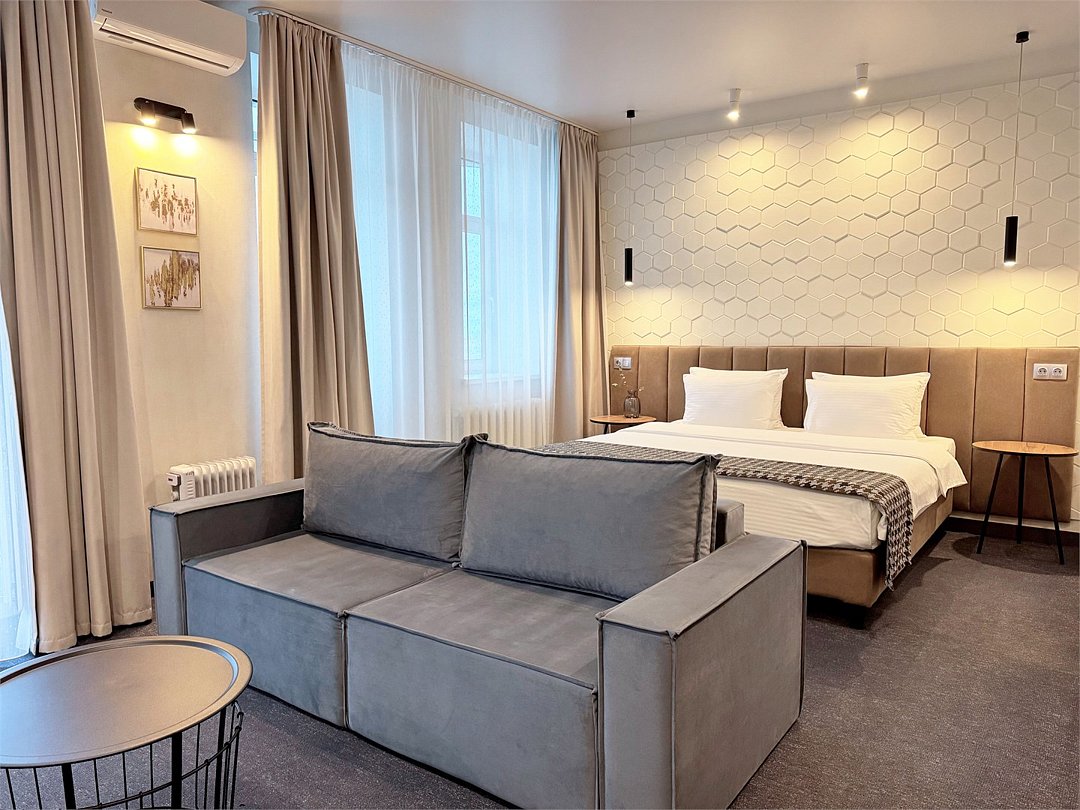Wi-Fi, кондиционер, светильник, настольные лампы, душевая кабина, ванна, халаты, банные полотенца, тапочки, косметические средства, балкон, двуспальная кровать, диван, шкаф для одежды, вешалки, зеркало, чайный набор, чайник, унитаз, раковина, вид на город, стул, тумба, внутренний телефон, мини-холодильник, телевизор со Smart TV, рабочий стол, гигиенический душ, бутилированная вода, шапочка для душа, можно с питомцами, часы-будильникВ номере