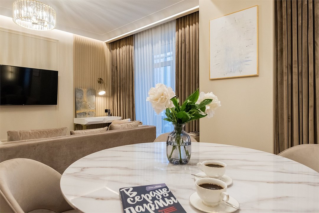 Идеальное сочетание элегантности, стиля и комфорта. Две комнаты с панорамными окнами: уютная спальня и гостиная, совмещенная с кухней полностью оборудованная современной техникой. Просторный санузел: ванна + душевое ограждение, полноценная умывальная зона с большой столешницей для туалетных принадлежностей.Услуги и удобства