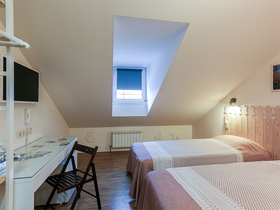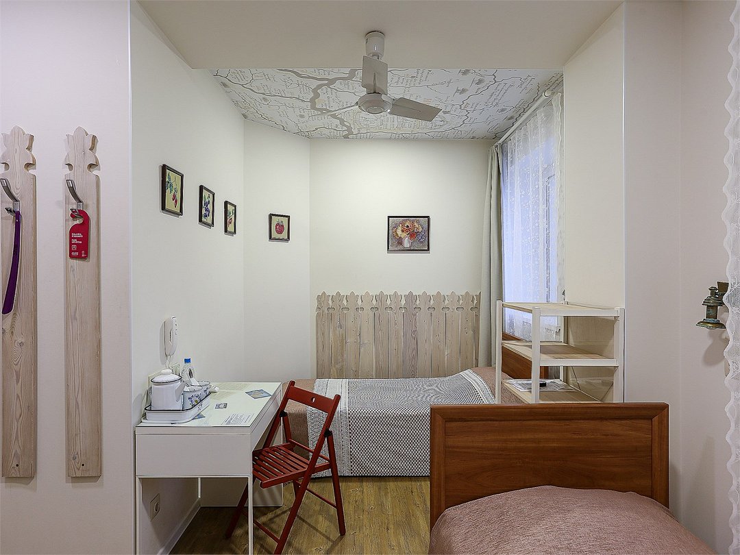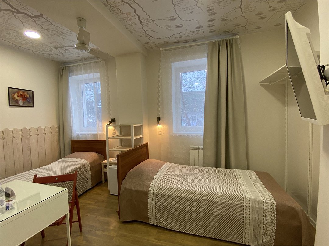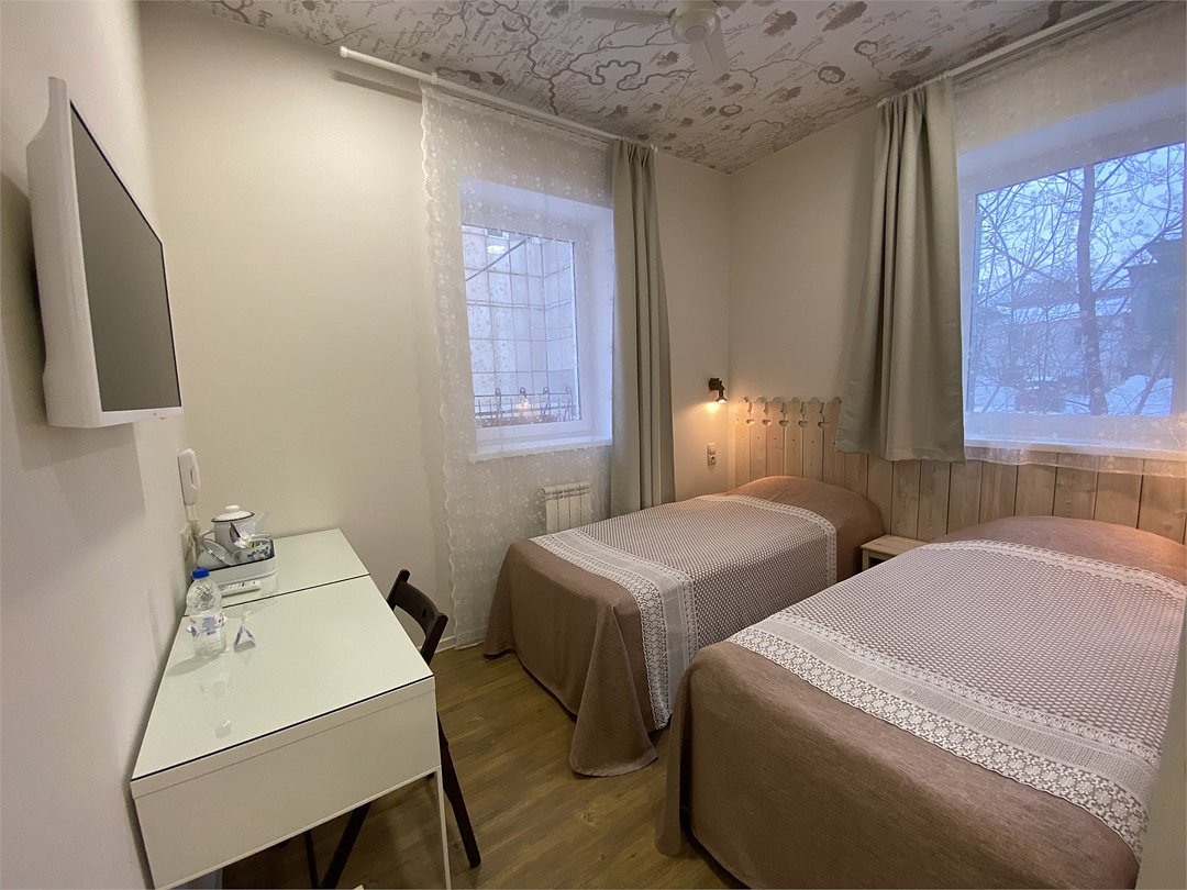 телевизор, кабельное телевидение, Wi-Fi, светильник, фен, вентилятор, электронные замки, ванная комната, банные полотенца, тапочки, две односпальные кровати, вешалки, зеркало, набор посуды, унитаз, раковина, душ, вид на город, кулер на этаже, стул, стол, внутренний телефон, мини-холодильник, номер для некурящих, без питомцевВ гостиничном номере