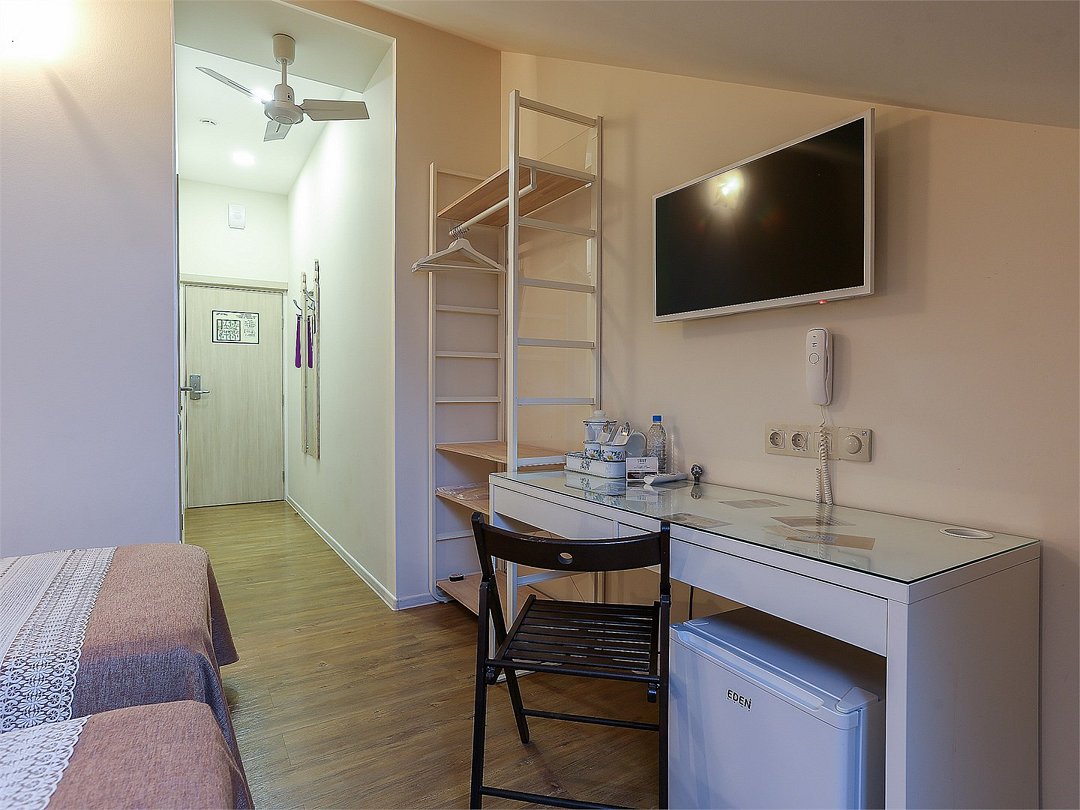 телевизор, кабельное телевидение, Wi-Fi, светильник, фен, вентилятор, электронные замки, банные полотенца, тапочки, две односпальные кровати, вешалки, зеркало, набор посуды, унитаз, раковина, душ, вид на город, кулер на этаже, стул, стол, раскладное кресло, внутренний телефон, мини-холодильник, номер для некурящих, без питомцевВ гостиничном номере
