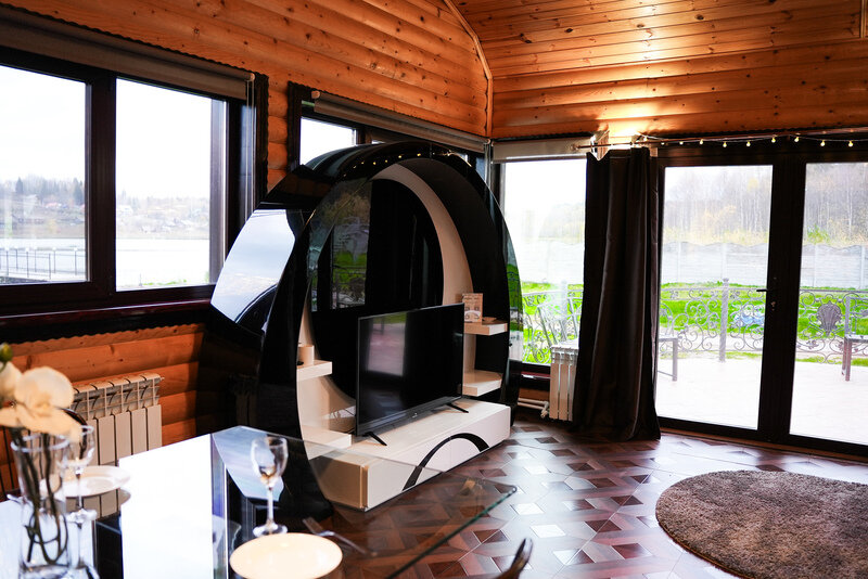Уютный вместительный дом c панорамными окнами в 360 градусов . Из комнаты открывается чудесный вид реку и бассейн. Коттедж подходит для романтических уикендов, отдыха с детьми или друзьями.