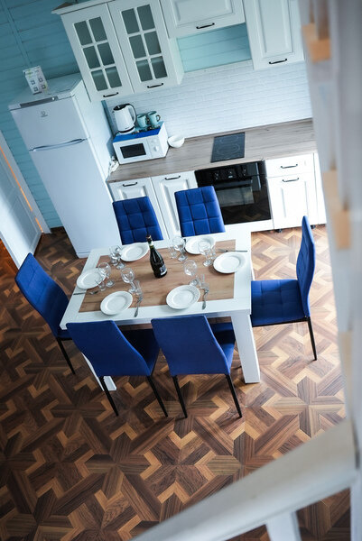 На 1 этаже: обеденный стол, кухонный гарнитур, двуспальный диван, санузел.