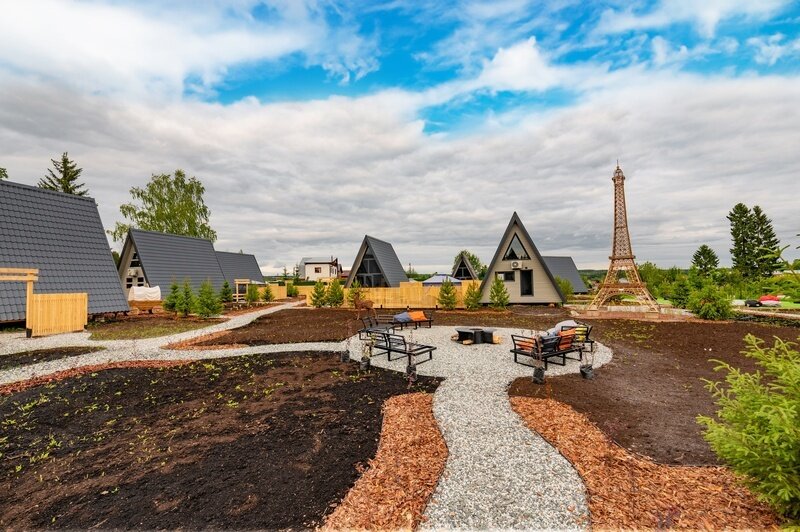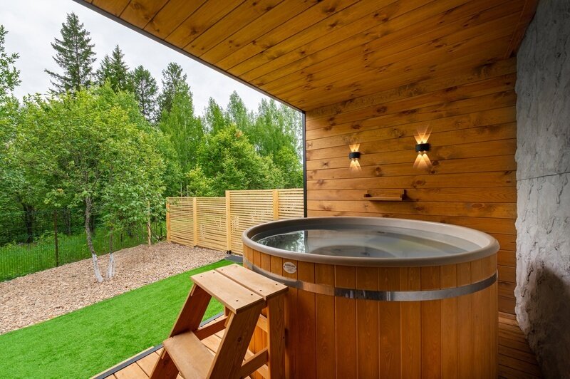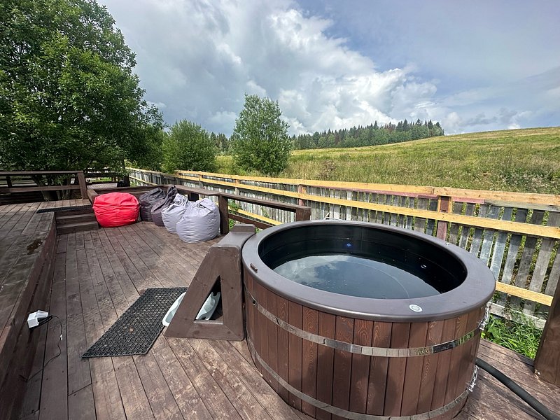 Территория базы отдыха оборудована парковкой, тропическим душем, кинотеатром под открытым небом, большим бассейном, баней, купелью фурако, беседкой, фотозоной, гигантскими шахматами, зонами отдыха и многим другим