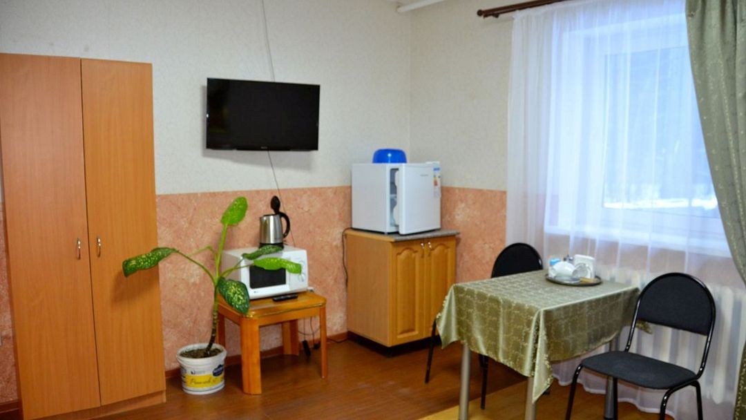 телевизор, микроволновая печь, двуспальная кровать, вешалки, мебельный гарнитур, чайный набор, набор посуды, чайник, отопление, вид во двор, стаканы, кухонная утварь, столовые приборы, стул, стол, санузел на этаже, диван-кровать, внутренний телефон, мини-холодильник, мини-кухня, вода из артезианской скважины, без питомцевВ гостиничном номере