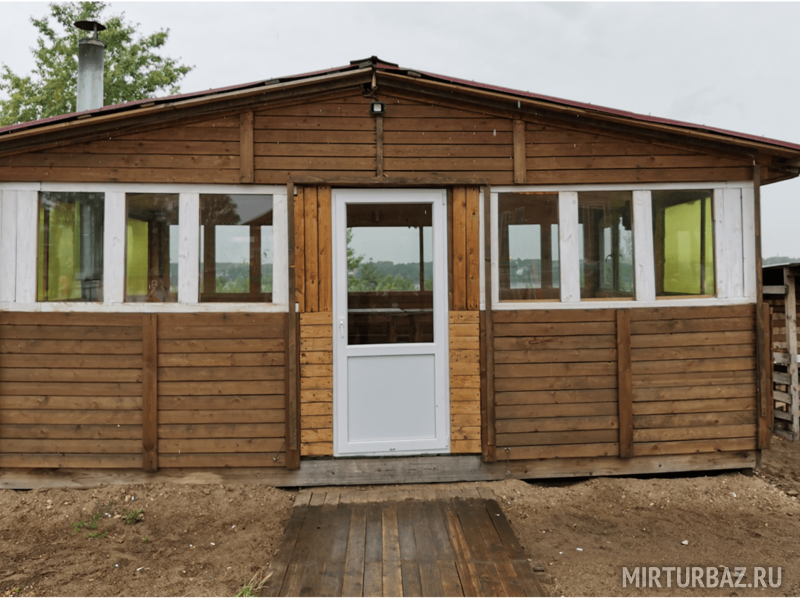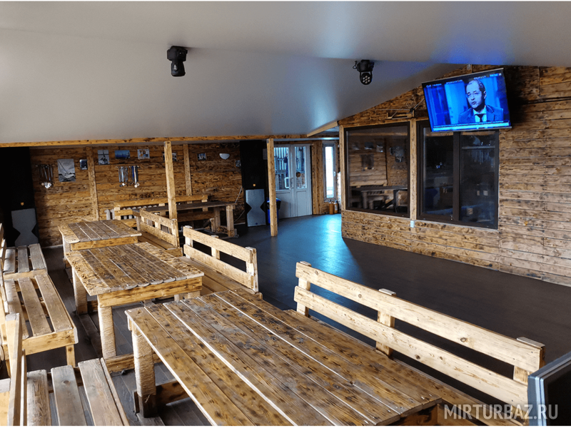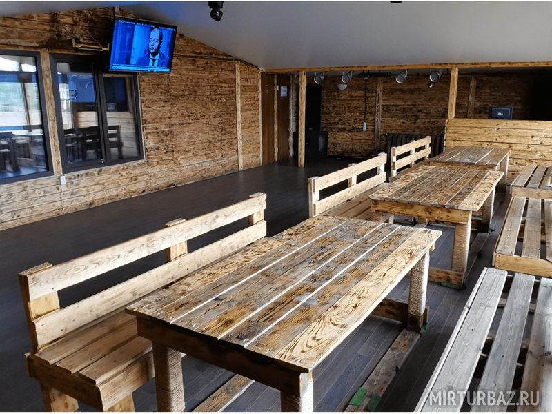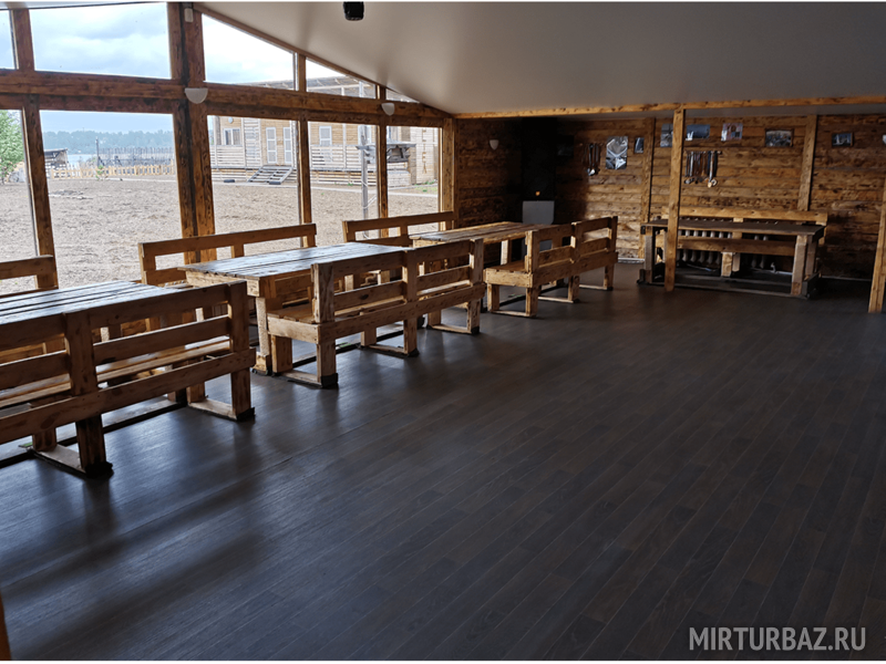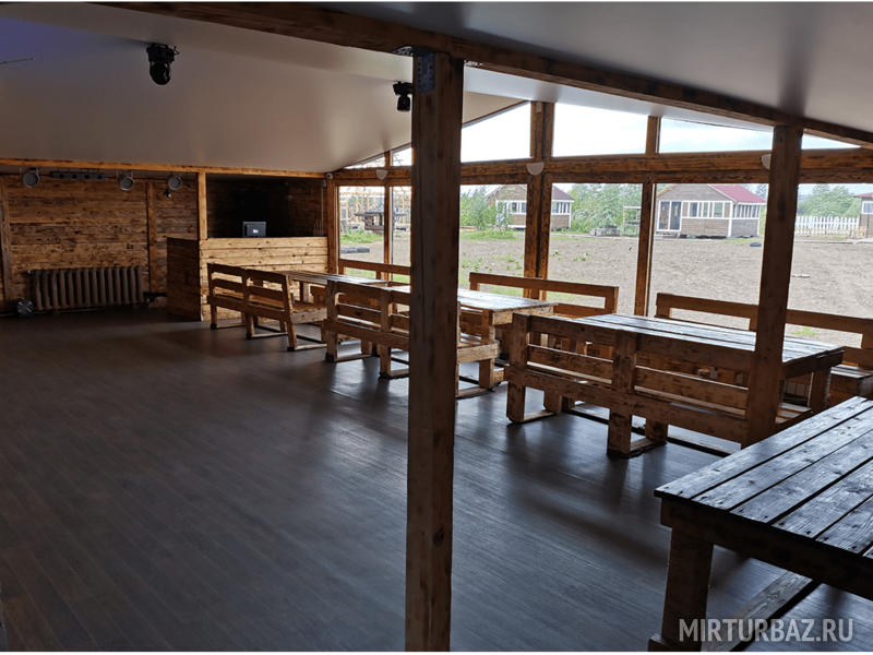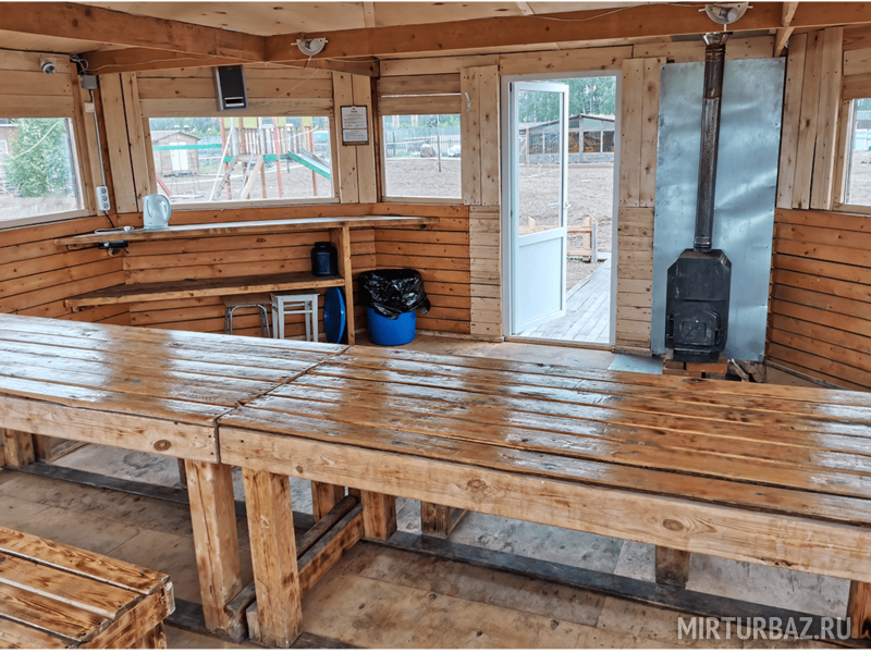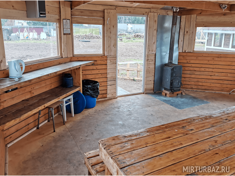 Розетка, освещение, дровяная конвекционная печь, 2 больших деревянных стола, 4 деревянных скамейки, кухонная стойка, чайник, аудиосистема, светомузыка.