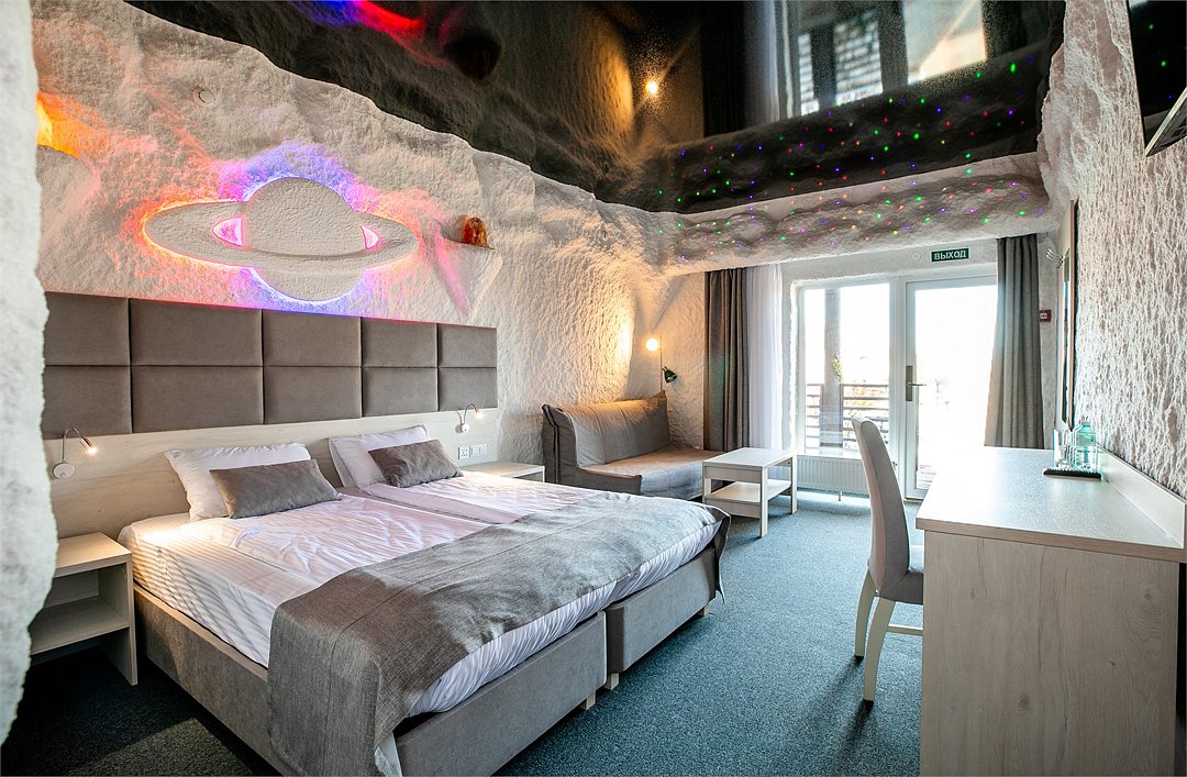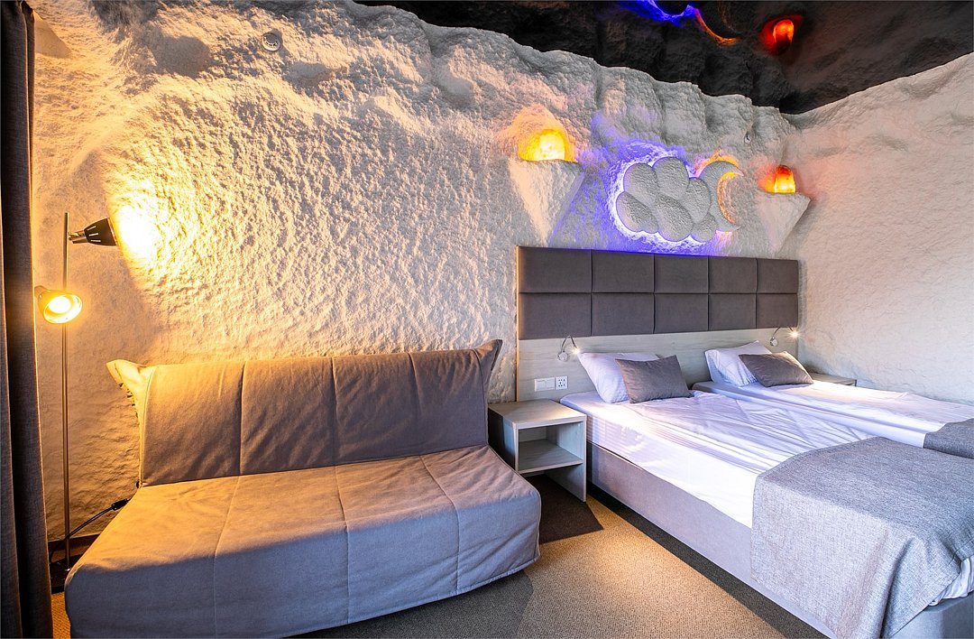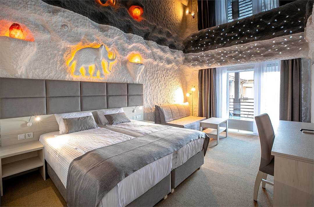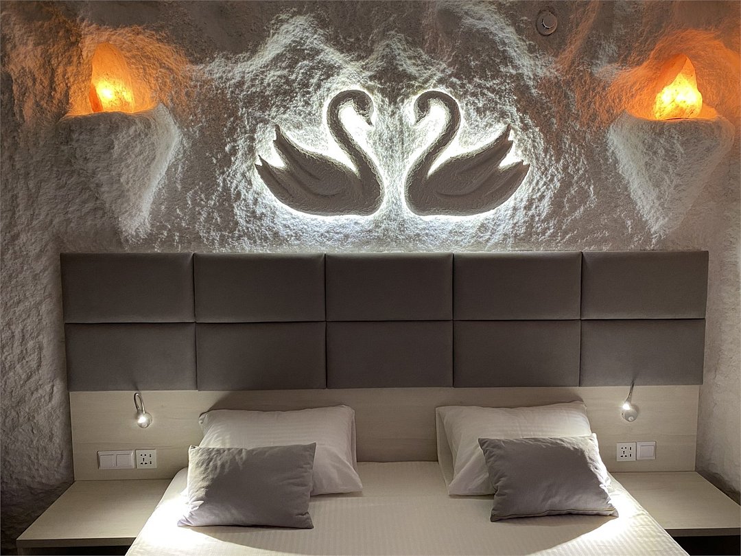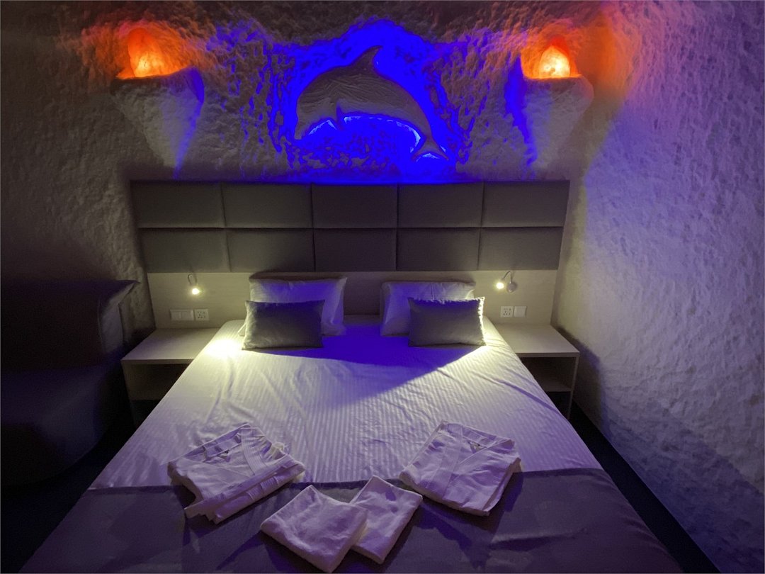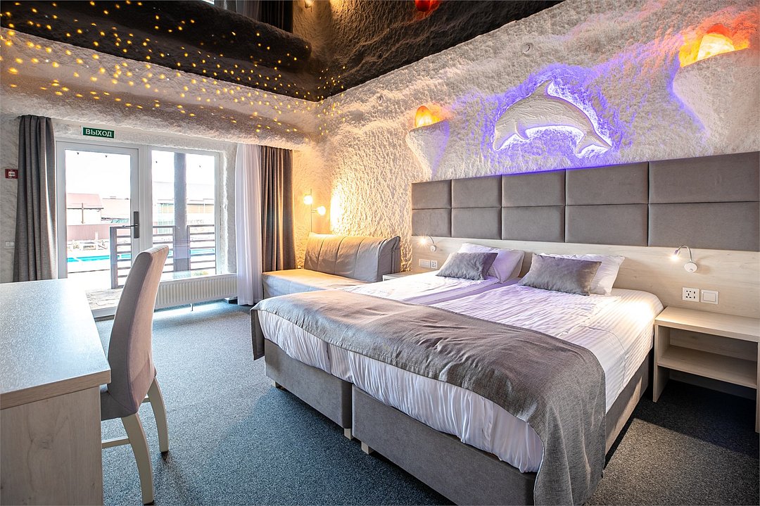 Наши соляные номера имеют разное дизайнерское исполнение, которое не оставит равнодушным. Соляной номер оснащен ванной со всеми необходимыми средствами (фен, розетка, гигиен. душ, зеркало с подсветкой, увеличивающее зеркало и т.п) имеется панорамное окно. Термоэлектрический холодильник (бар) даст Вам спокойно выспаться ночью без шума, а шторы blackout не дадут солнечному свету вас разбудить с утра. На полу приятный коммерческий теплый ковролин, панорамные окна с видом на бассейнУслуги и удобства
