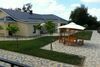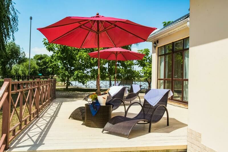 Шезлонги, зонты. Можно купаться как в пруду, так и в бассейне.