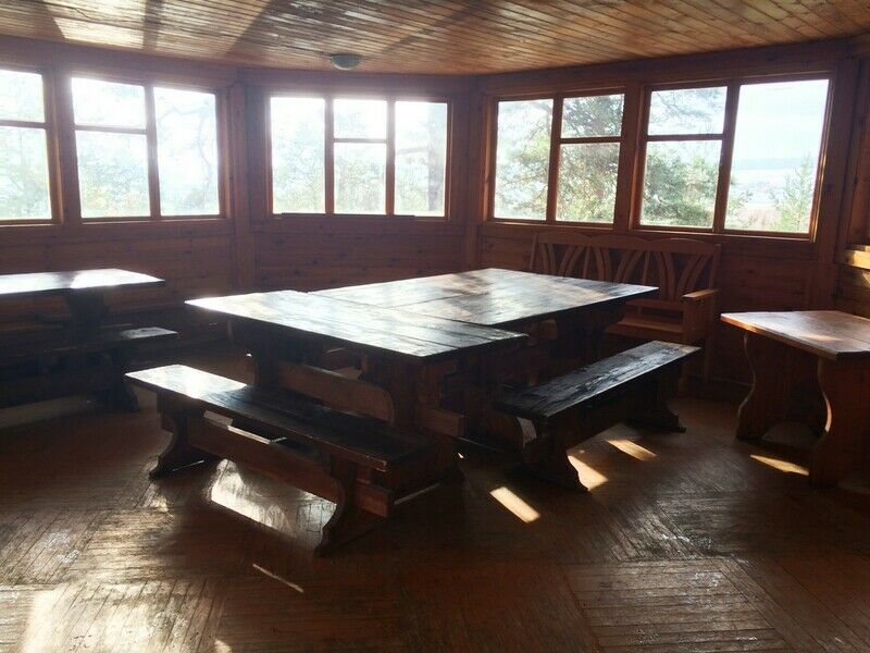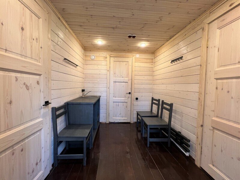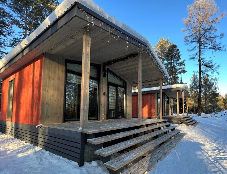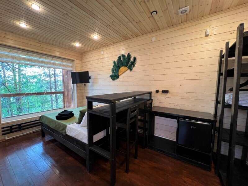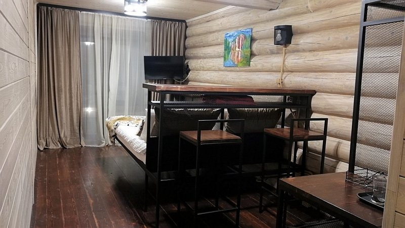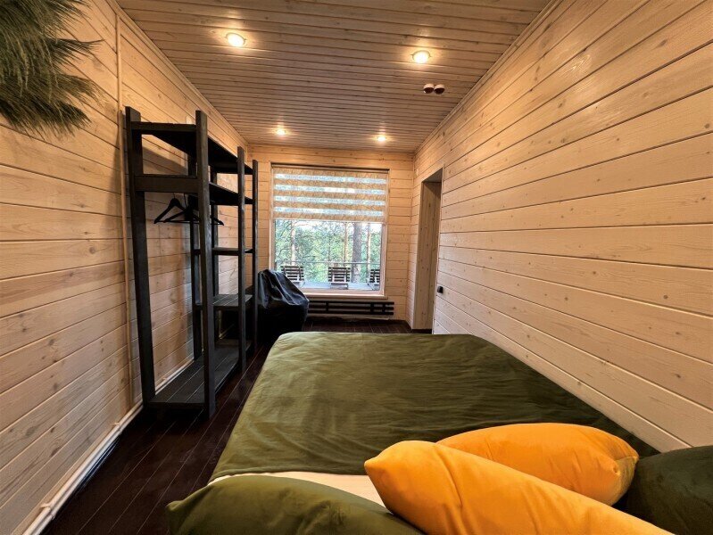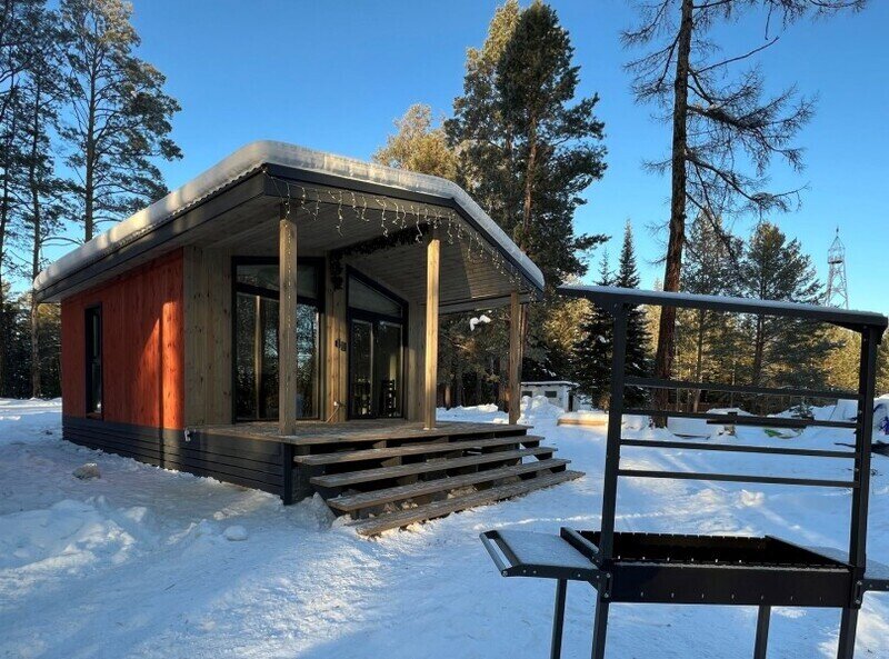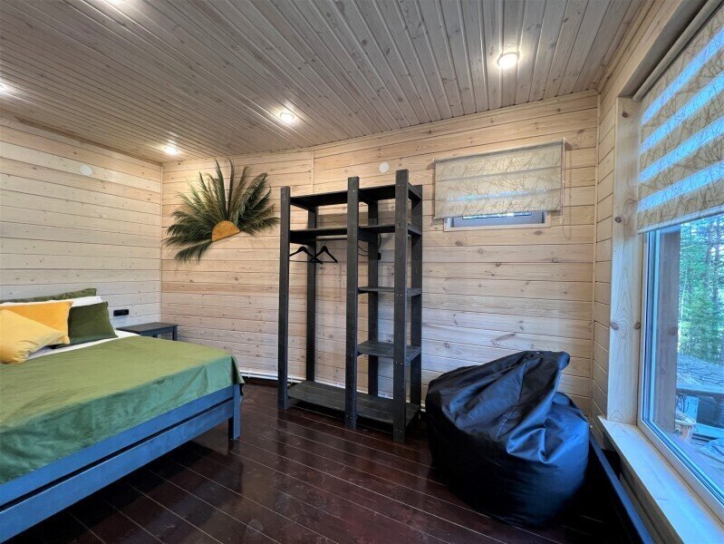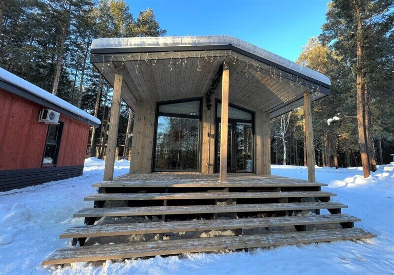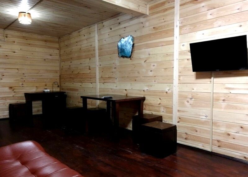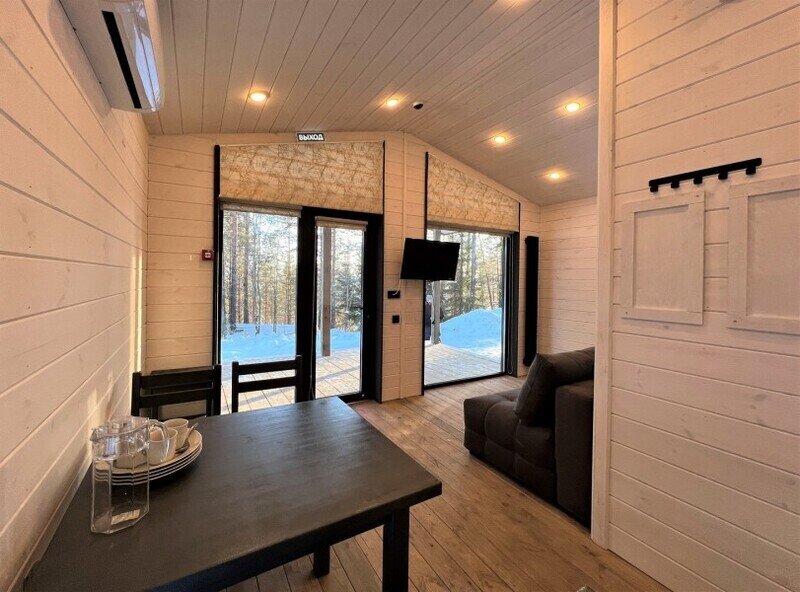 Для граждан 18+, для комфортного размещения, для вип-гостей, которые любят уединение и комфорт. Одноэтажный домик с панорамными окнами и отдельным входом. Одна комната — спальня с двуспальной кроватью, стол, стулья, холодильник, чайник, телевизор.