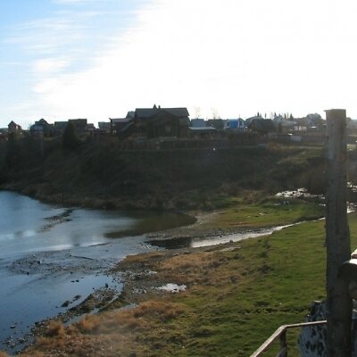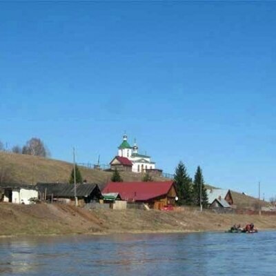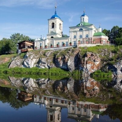 Если встать к главному входу в церковь спиной и посмотреть левее, то можно увидеть на другом берегу реки турбазу «Чусовая» на скале Собачьи ребра.
