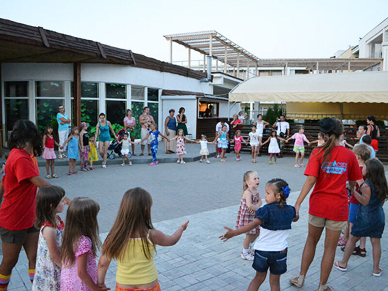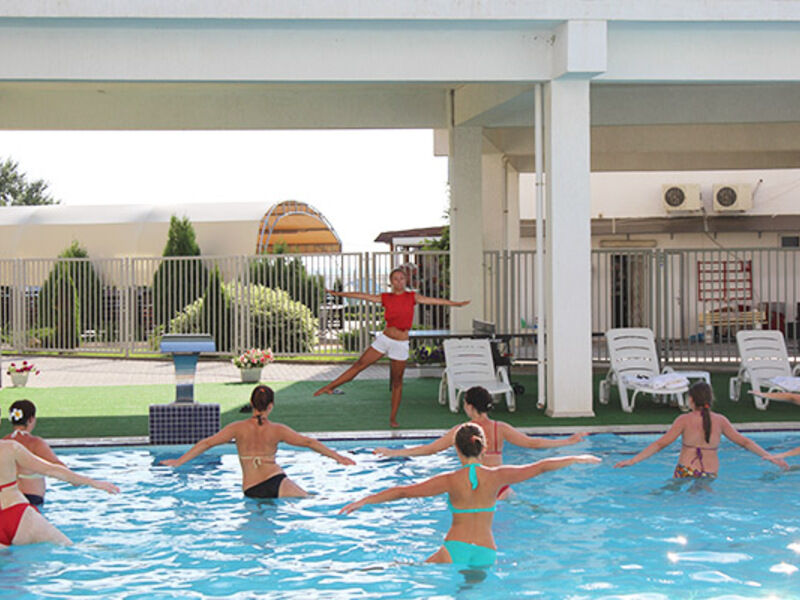 Летом по вечерам устраивают дискотеки, в бассейне тренер преподает аэробику. Баскетбольная, волейбольная и теннисные площадки в открытом доступе. Питание в отеле 3-х разовое по меню или шведский стол, в зависимости от загруженности отеля. В комплексе есть заведения общепита: летнее кафе на террасе и столовая.