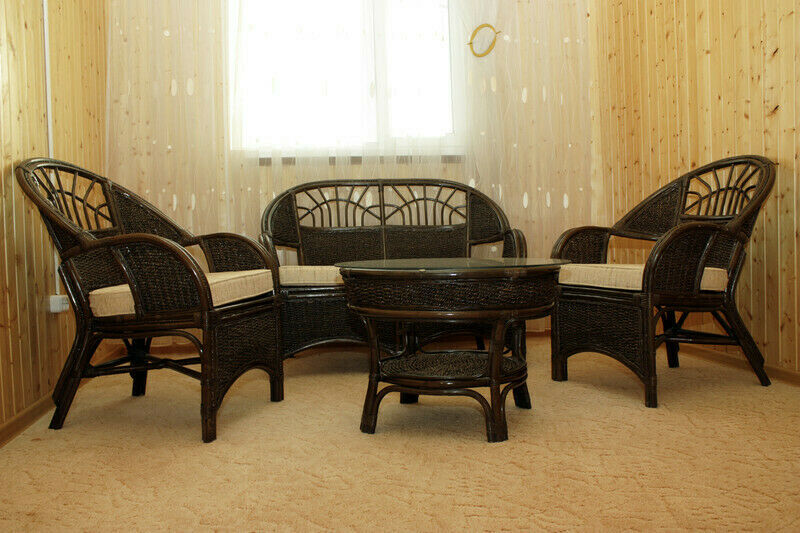 Двуспальные и односпальные кровати, прикроватные тумбочки, журнальный столик, телевизор, холодильник, плетеный диван и кресла, душевая кабина, раковина унитаз, встроенные шкафы для верхней одежды.