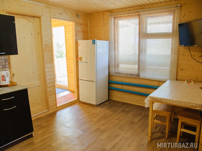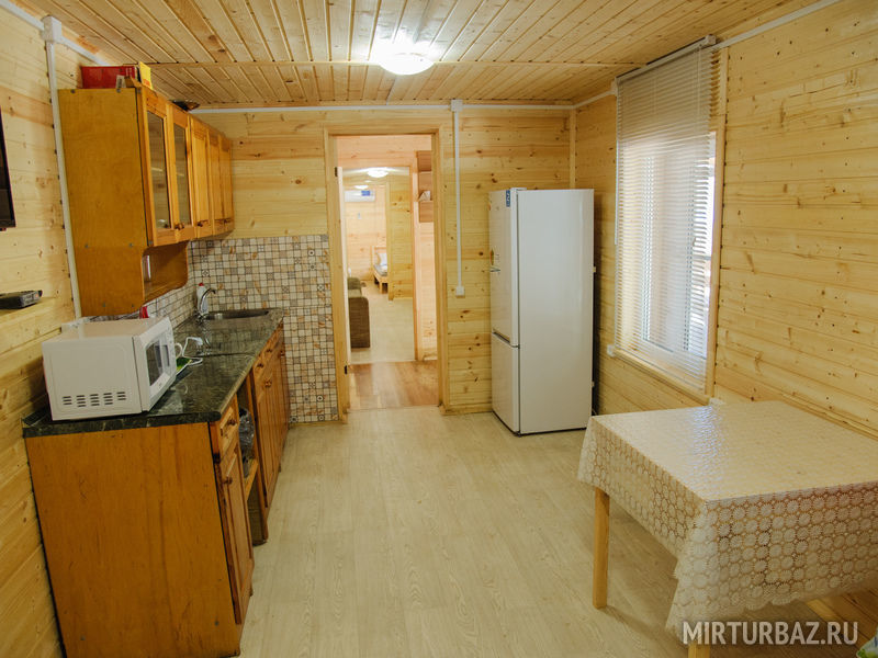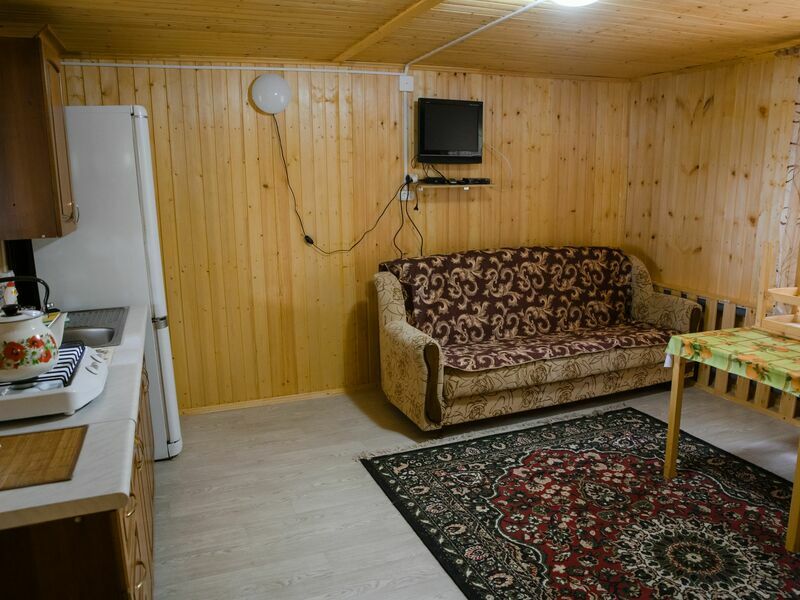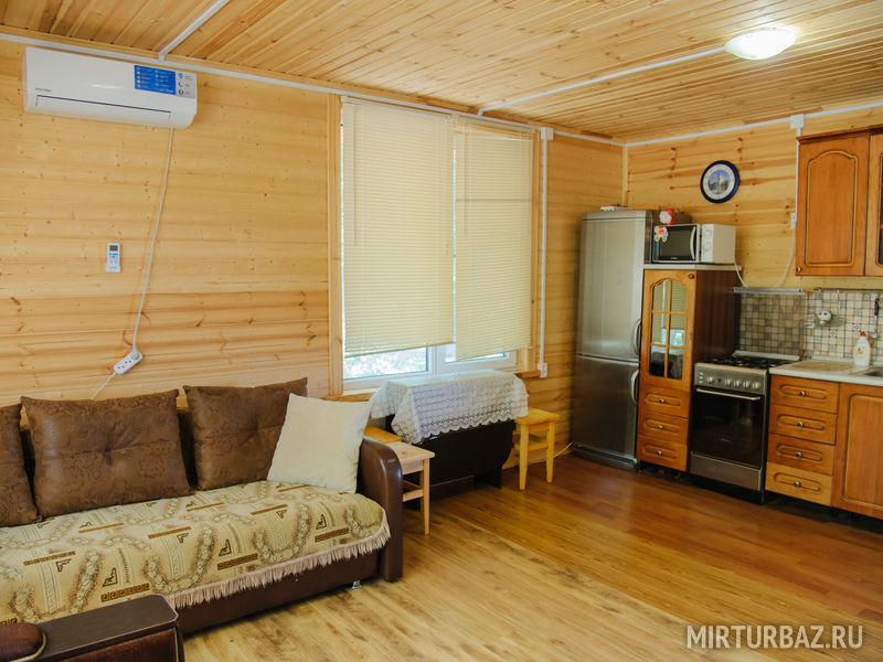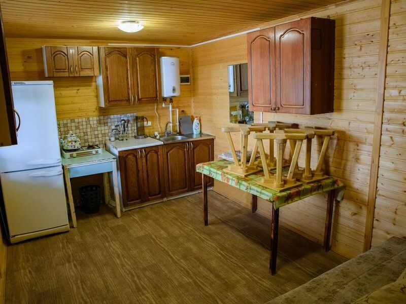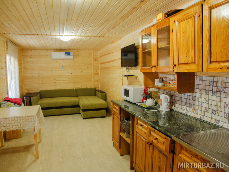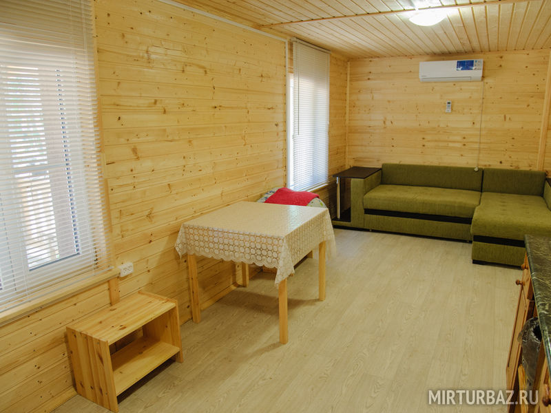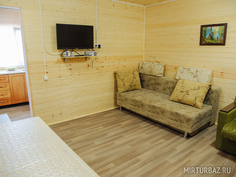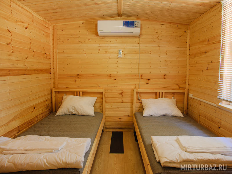 В домике есть большая комната в которой расположена кухня, диван и телевизор. В маленькой комнате две раздельные кровати. Домик отапливается.