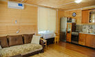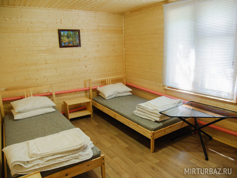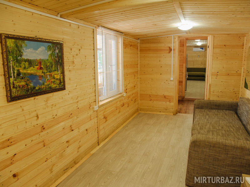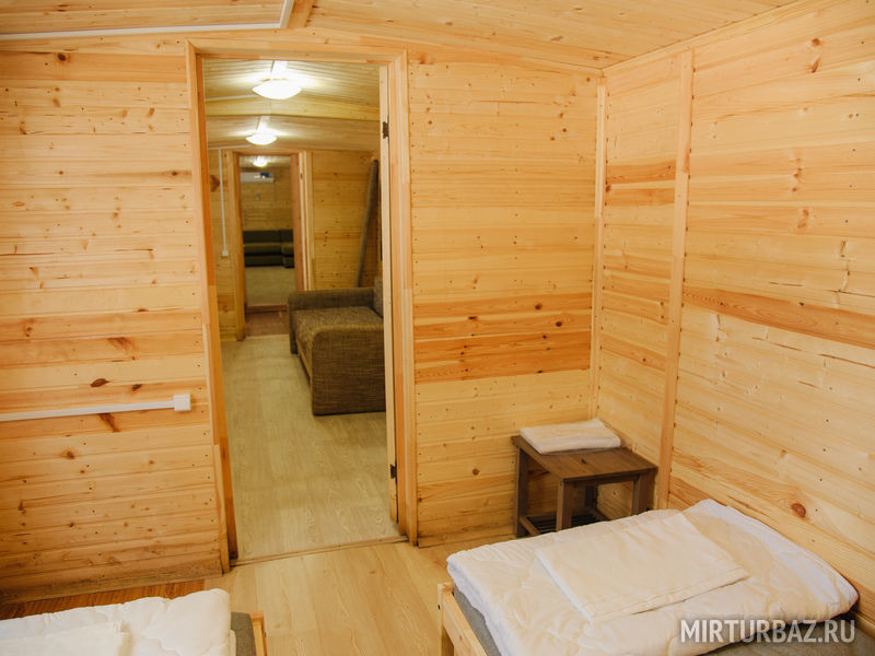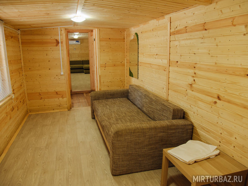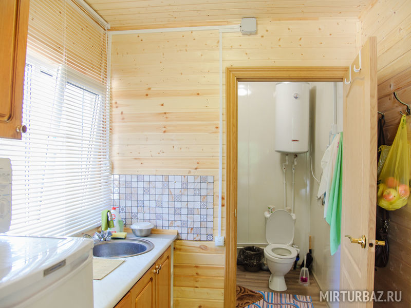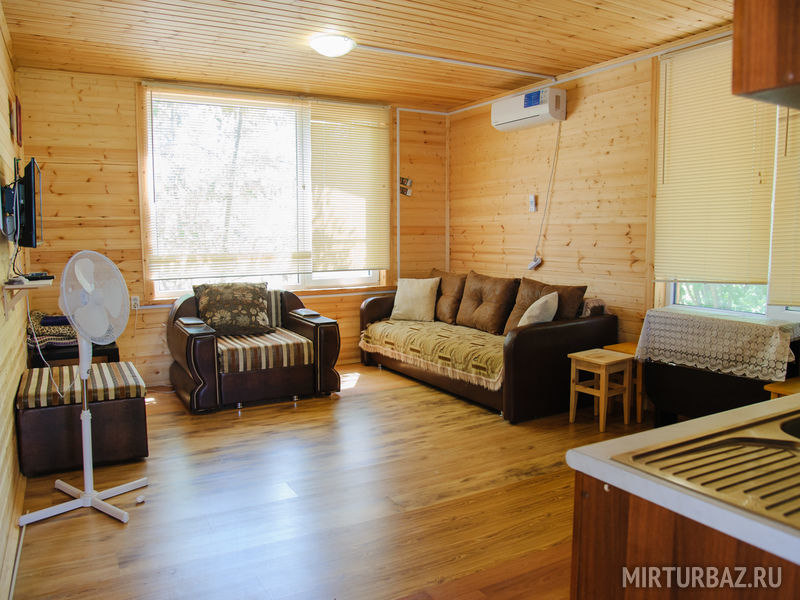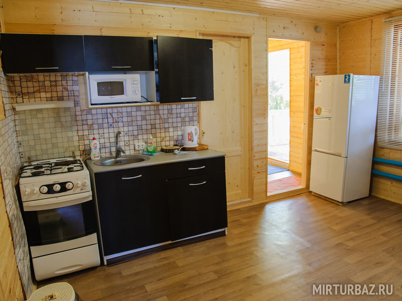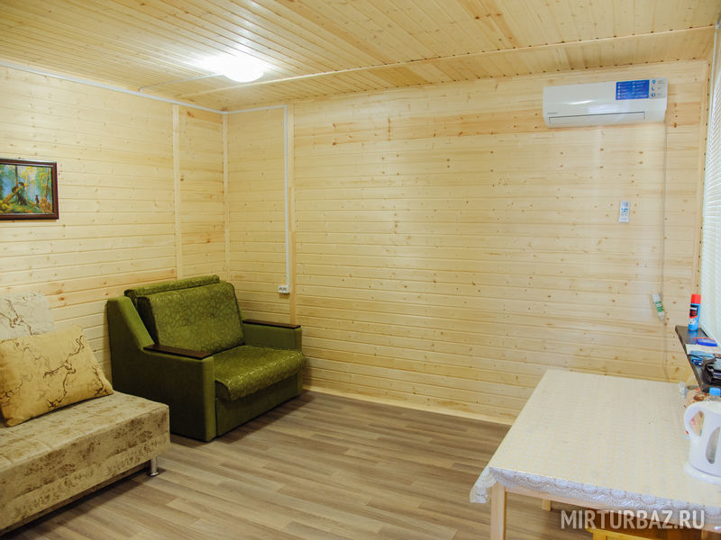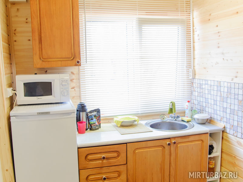 В домике есть большая комната в которой расположена кухня, диван и телевизор. В маленькой комнате две раздельные кровати. Домик отапливается.