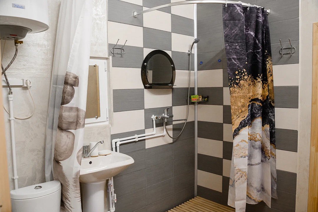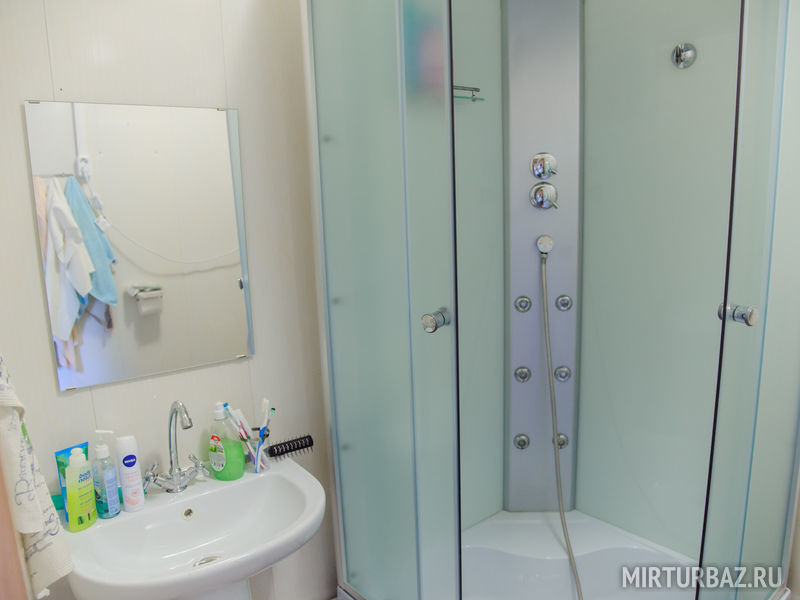 Без сан.узла. 2 односпальные кровати, диван двуспальный, кухня полностью оборудованная.
