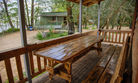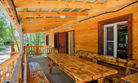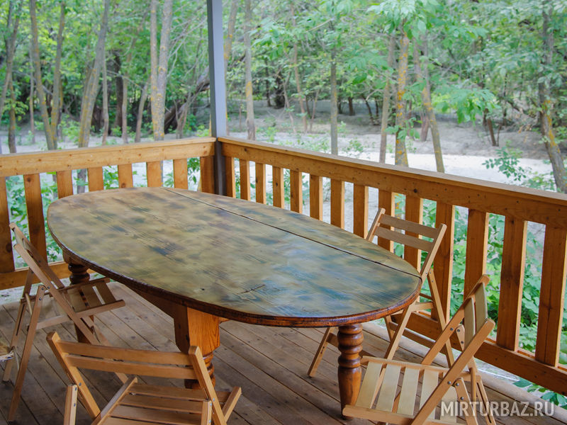 В комнате раскладной диван на двух человек и кресло-кровать. В домике душевая кабина, туалет, кондиционер, холодильник, газовая плита, микроволновка, чайник, телевизор, тумбочки и посуда. Стол и стулья. Постель и полотенца. На веранде большой стол.
