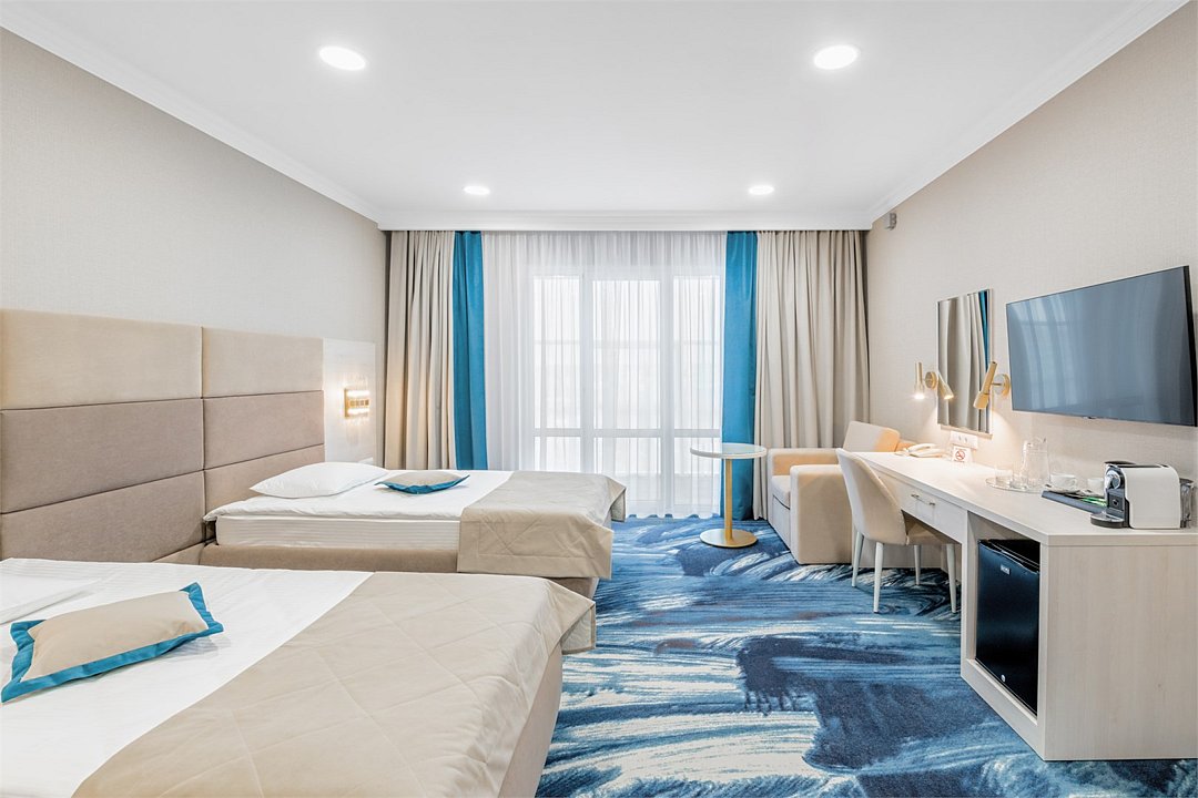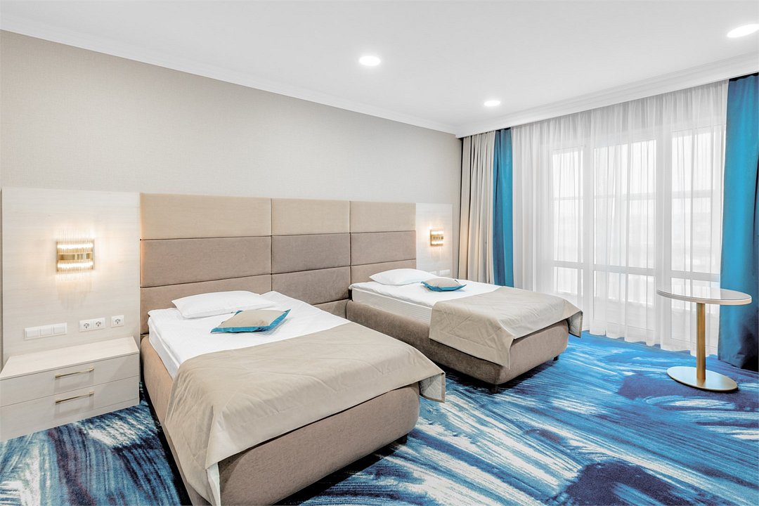 Просторный и светлый номер оформлен в современной стилистике. В этом комфортабельном номере есть две односпальные кровати, рабочая зона с удобным письменным столом, гостиный уголок с креслами и столиком. Стоимость завтрака "шведский стол" включена в тариф номера.Услуги и удобства