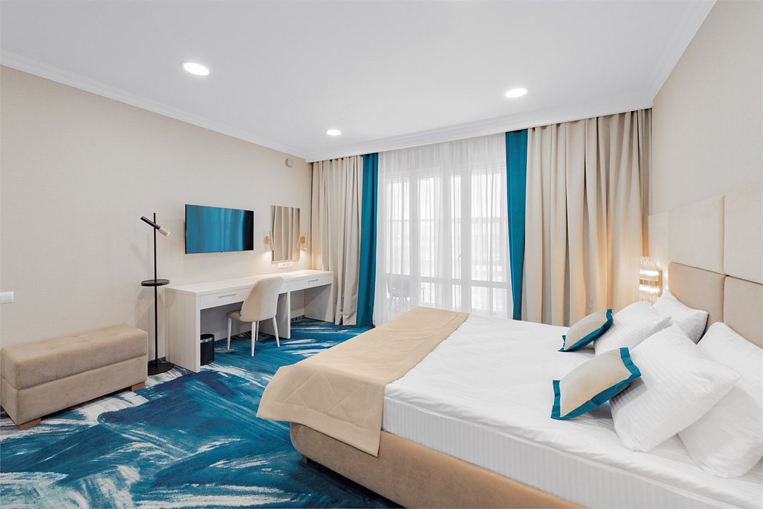 Просторные номера ”Делюкс” предлагают все необходимое для бизнес-путешественников - хорошо освещенный рабочий стол с доступом к бесплатному Wi-Fi интернету, а также набор канцелярских принадлежностей. К услугам гостей капсульная кофемашина, чайная станция, SMART TV. Номер рассчитан для размещения одного или двух человек, в том числе, как номер для молодожёнов. Стоимость завтрака "шведский стол" включена в тариф номера.Услуги и удобства