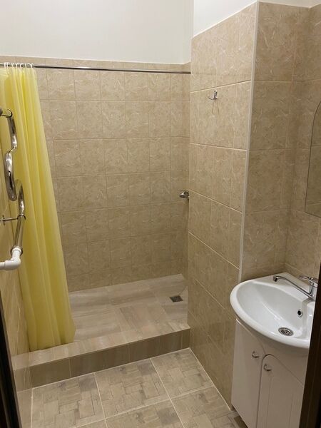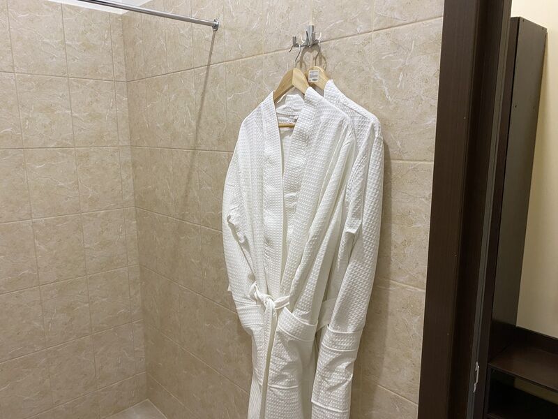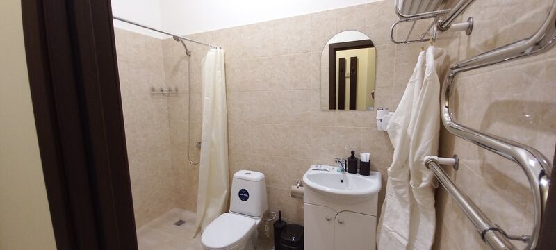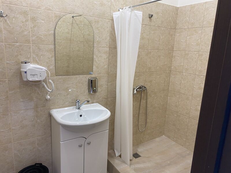 Имеется шкафчик для хранения вещей, фен, душ, раковина. Без окна. Туалет общий на этаже.