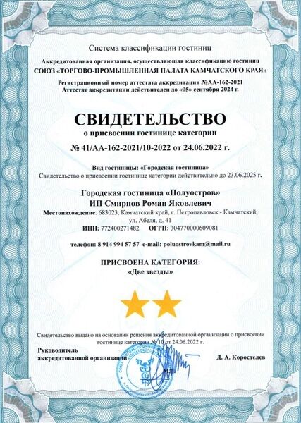 Мини-отель "Полуостров" находится в городе Петропавловск-Камчатский, вблизи Авачинской бухты. Номерной фонд состоит из двухместного номера, номера "Комфорт", и общих номеров для проживания большого количества людей (до 16) с двухъярусными кроватями.