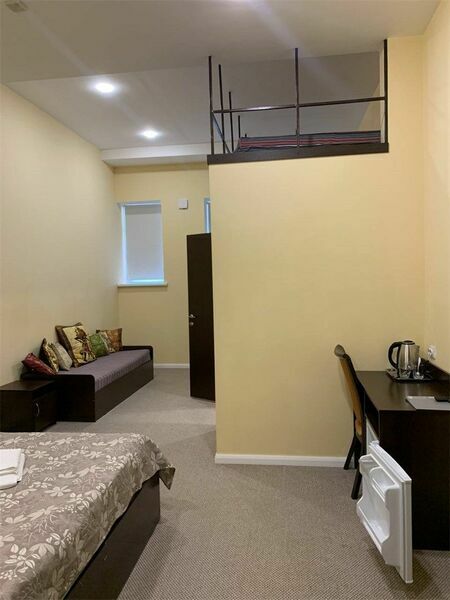 Двухуровневый номер повышенной комфортности. Номер рассчитан на 3 основных и 1 дополнительное место. Основные места: двуспальная кровать трансформер и полутороспальная кровать, расположенная на втором уровне. Дополнительное место: односпальная софа. Вместимость до четырёх человек. Номер имеет все удобства: телевизор, холодильник, чайник, сейф, санузел с душем, фен. Так же, на каждого гостя: туалетные принадлежности, полотенца, халаты и одноразовые тапочки.
