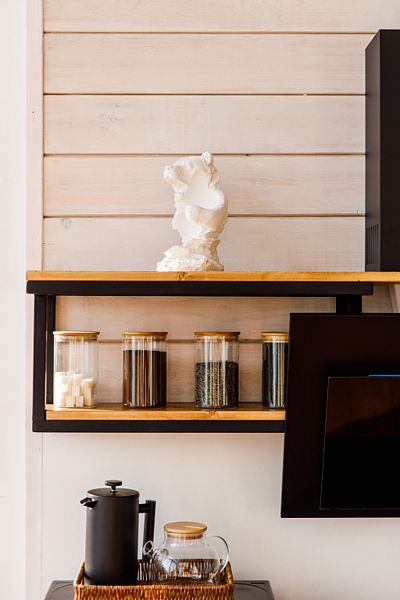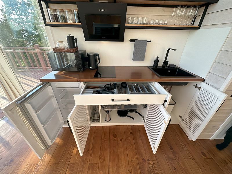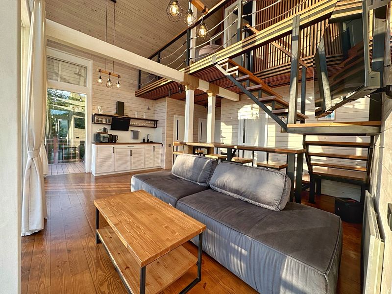 На первом этаже располагается уютная кухня-гостиная, ванная комната, хозяйственная комната со стиральной машиной и спальня с большой двухспальной кроватью. Зона кухни оборудована всей необходимой посудой и бытовой техникой. В зоне гостиной – раскладывающийся диван.