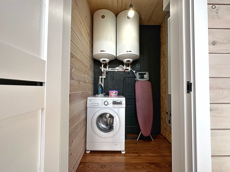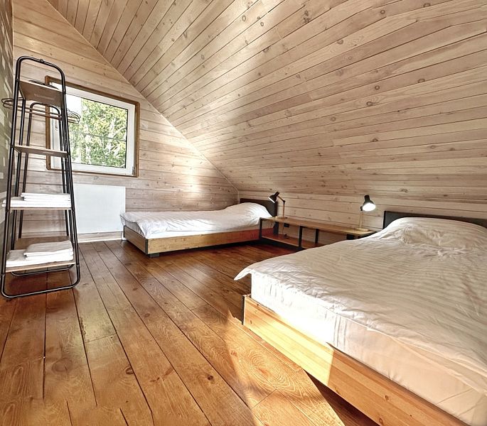 На втором этаже – две спальни с двухспальной и односпальными кроватями. Для поддержания оптимальной температуры дом снабжен сплит-системой и конверторными батареями.