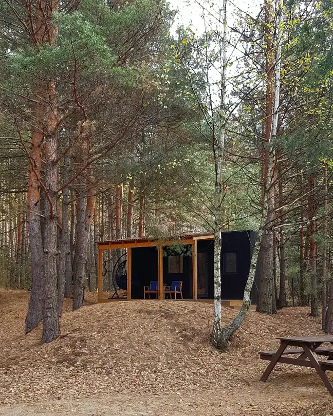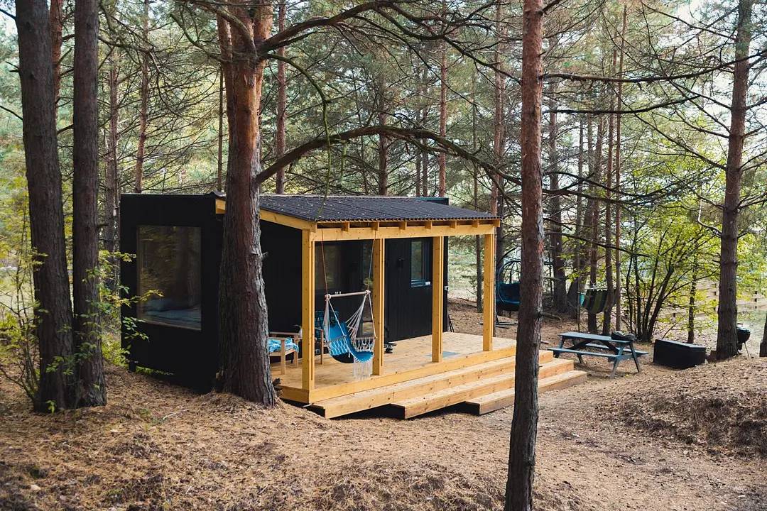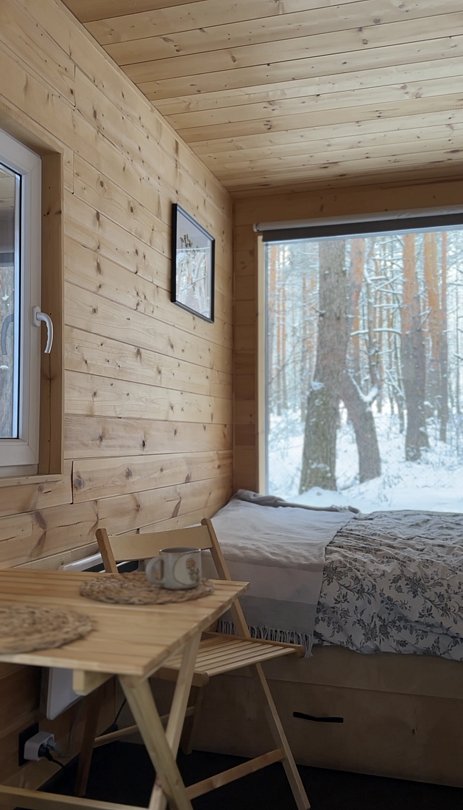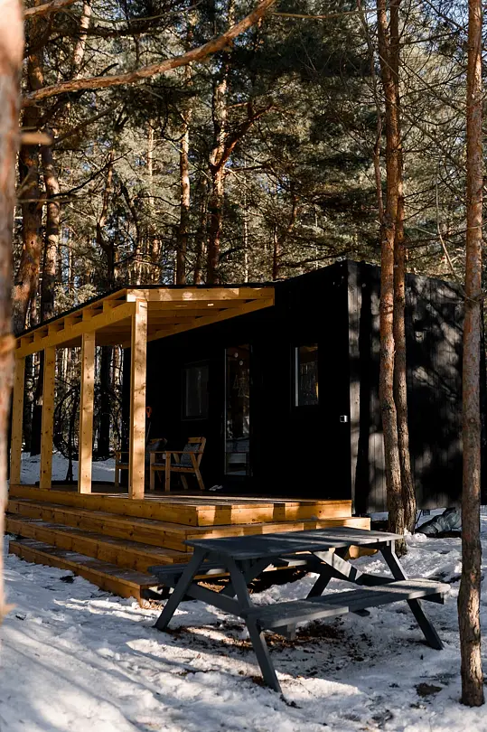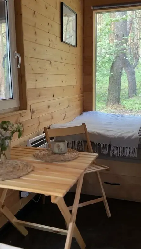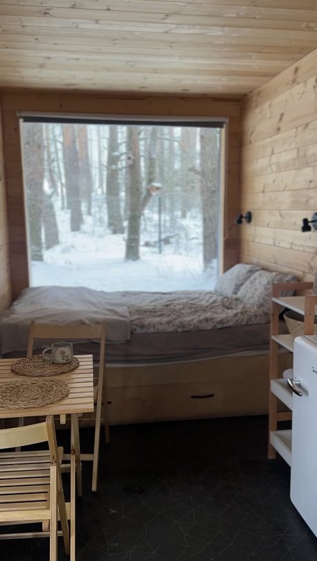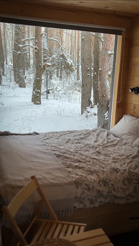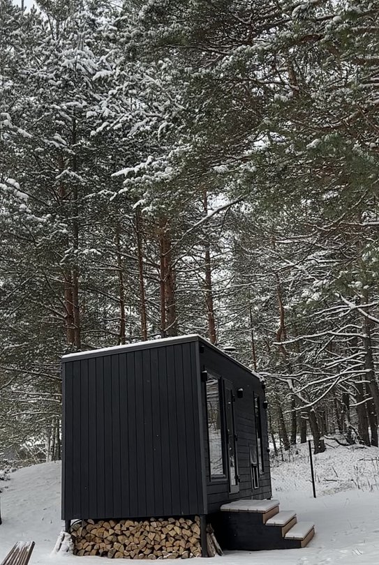 Уникальный минидом с огромным панорамным окном и чаном на дровах в сосновом лесу.