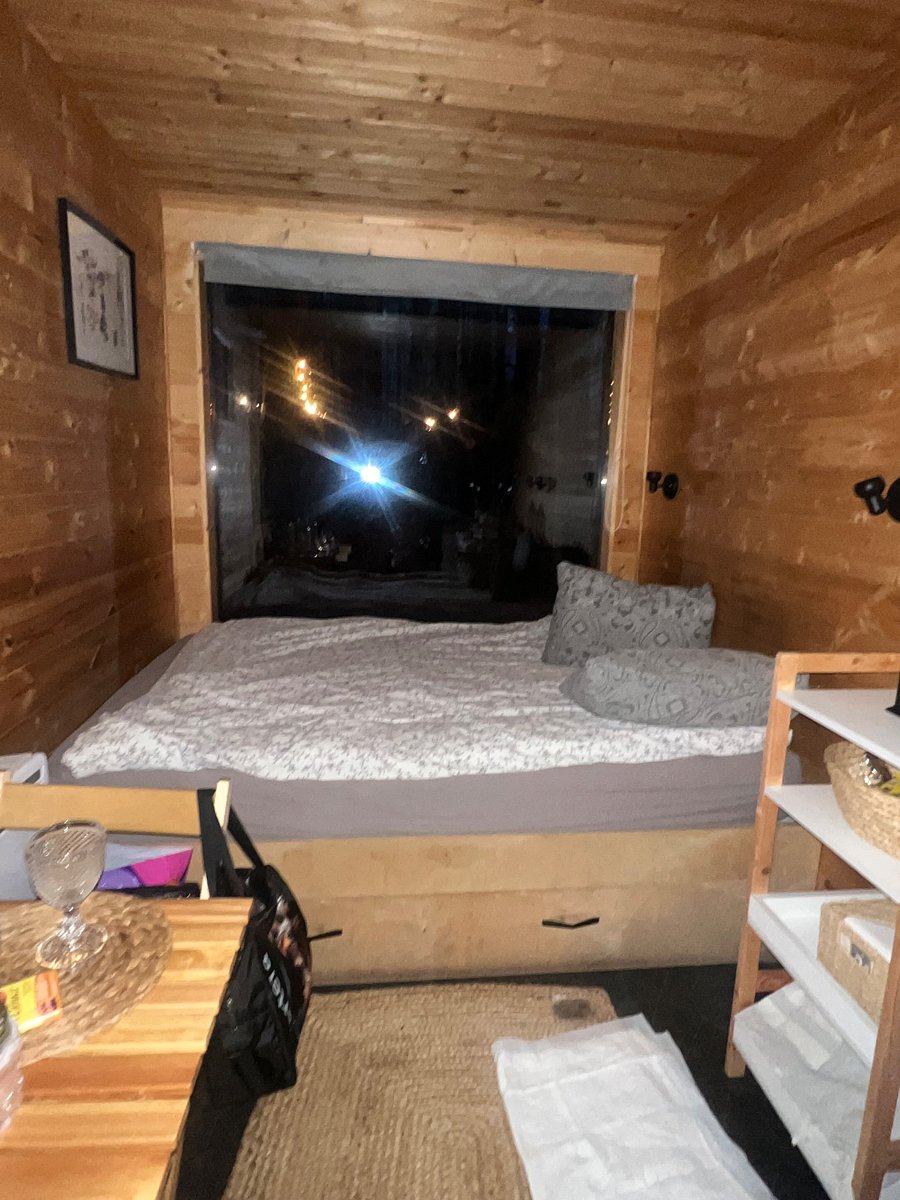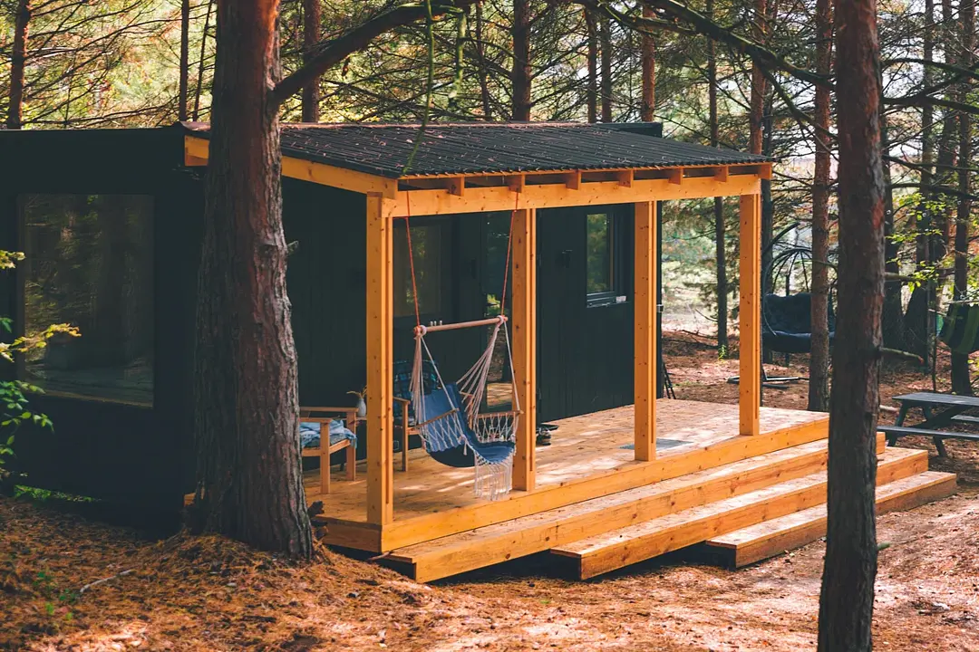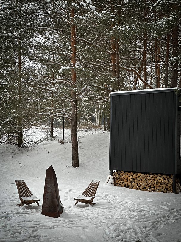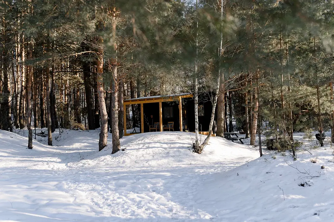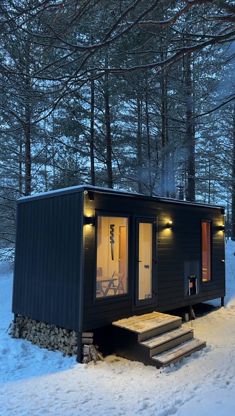 Уникальный минидом с огромным панорамным окном и чаном на дровах в сосновом лесу.