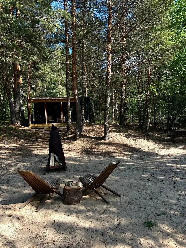 Уютный глэмпинг «Место под соснами» с панорамными окнами и дровяным чаном ждет вас в живописном сосновом лесу Рязанской области. Этот уединенный дом расположен на краю села Петровичи, прямо среди деревьев, что гарантирует полное погружение в природу. Рядом находится озеро, а неподалеку — святые источники и купели, куда можно дойти пешком.