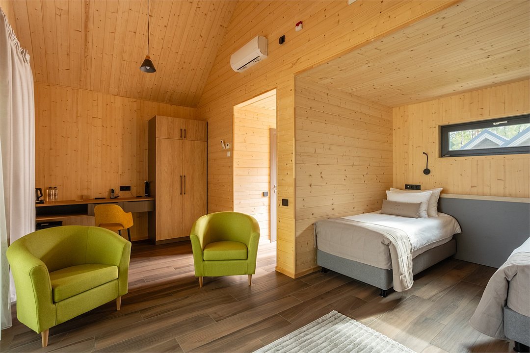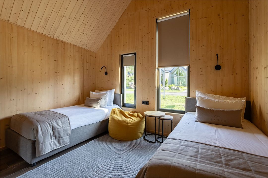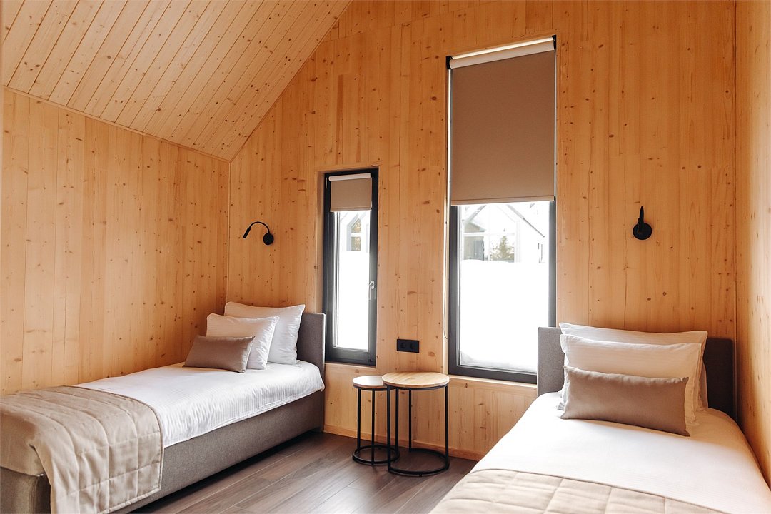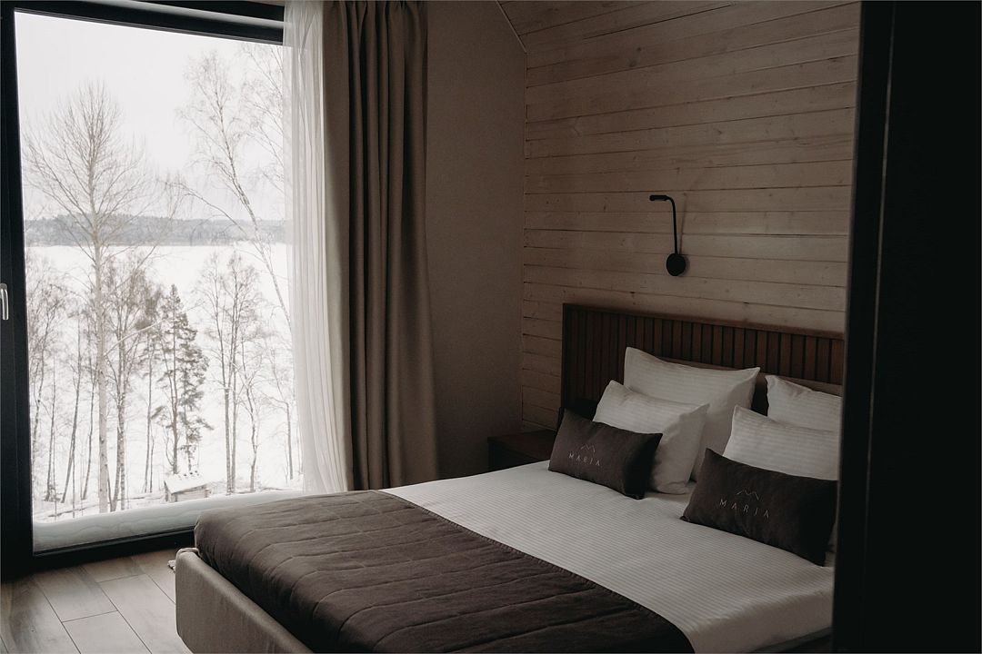 Вариант размещения подходит для компаний или семей с детьми старше 5 лет. Двухэтажная вилла площадью 144 кв.м. с тремя изолированными спальнями, просторной кухней-гостиной с камином, а также дополнительной зоной отдыха на втором этаже с панорамным окном - удобные кресла с кофейным столиком позволят с комфортом любоваться живописным видом на лес и озеро. Во всех виллах предусмотрен отдельный вход и терраса, также смотрящая на озеро. В каждом номере вы найдете все что нужно для действительно комфортного проживания: удобная мебель, две односпальные кровати в одной спальне и две спальни с двуспальной кроватью, 2 просторные ванные комнаты с душевой кабиной, полотенцами и феном, 2 телевизора, персональный сейф.Услуги и удобства