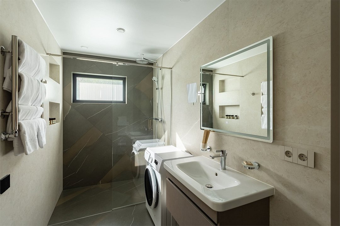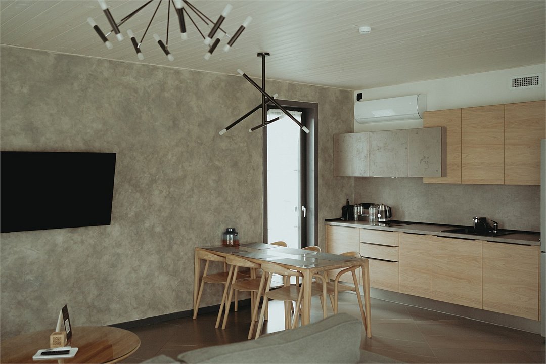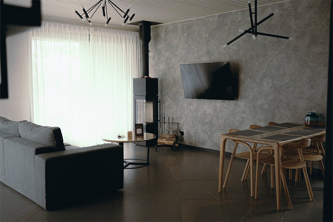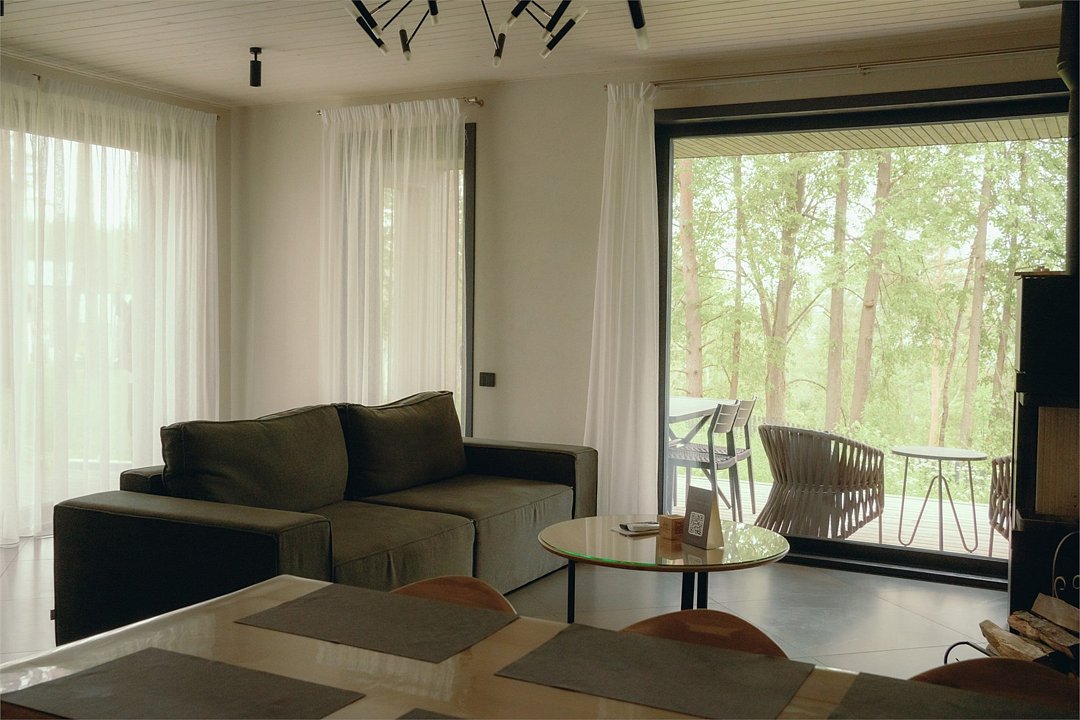 Вилла для тех, кто давно мечтал об отдыхе небольшой компанией друзей или семьей. Две изолированные спальни, просторная кухня-гостиная с выходом на террасу, панорамные окна с видом на лес - для полного комфорта и перезагрузкиУслуги и удобства